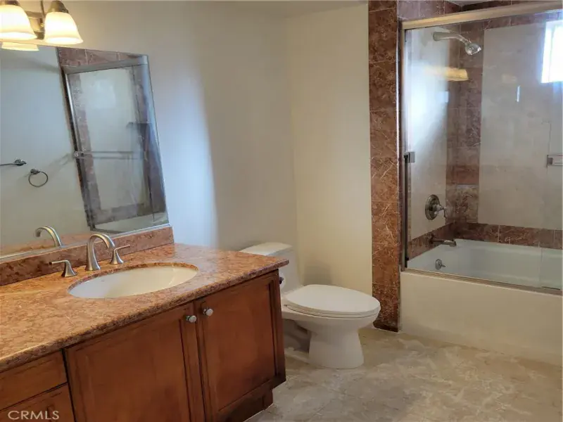 The interior features a stylish kitchen with granite countertops, European cabinetry, and stainless-steel appliances. Flooring has been thoughtfully upgraded with modern waterproof vinyl plank flooring and brand-new plush carpet in the bedrooms. Both bathrooms are elegantly appointed with Italian marble countertops, travertine tile flooring, and tiled shower enclosures, creating a spa-like atmosphere.