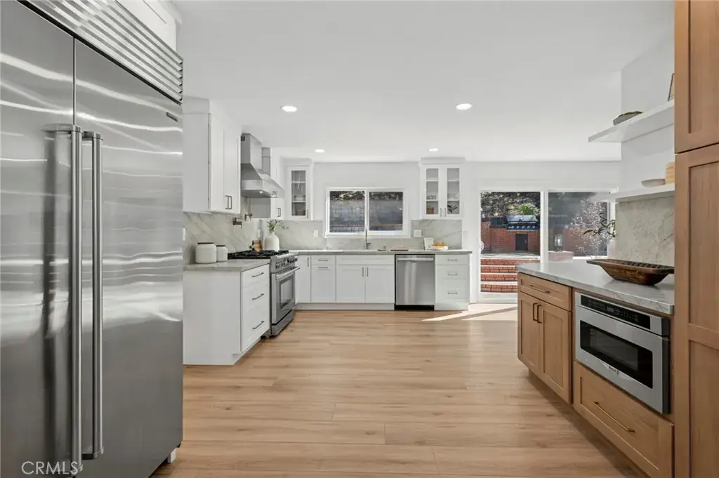 The heart of the home is an open-concept chef’s kitchen showcasing a built-in Sub-Zero refrigerator, Thor appliance suite, two-tone soft-close cabinetry, and elegant quartzite countertops and backsplash. A glass pantry wine display adds a custom touch, while the kitchen flows effortlessly into the bright, spacious living areas featuring luxury vinyl flooring and a custom-designed electric fireplace that anchors the space with warmth and style.