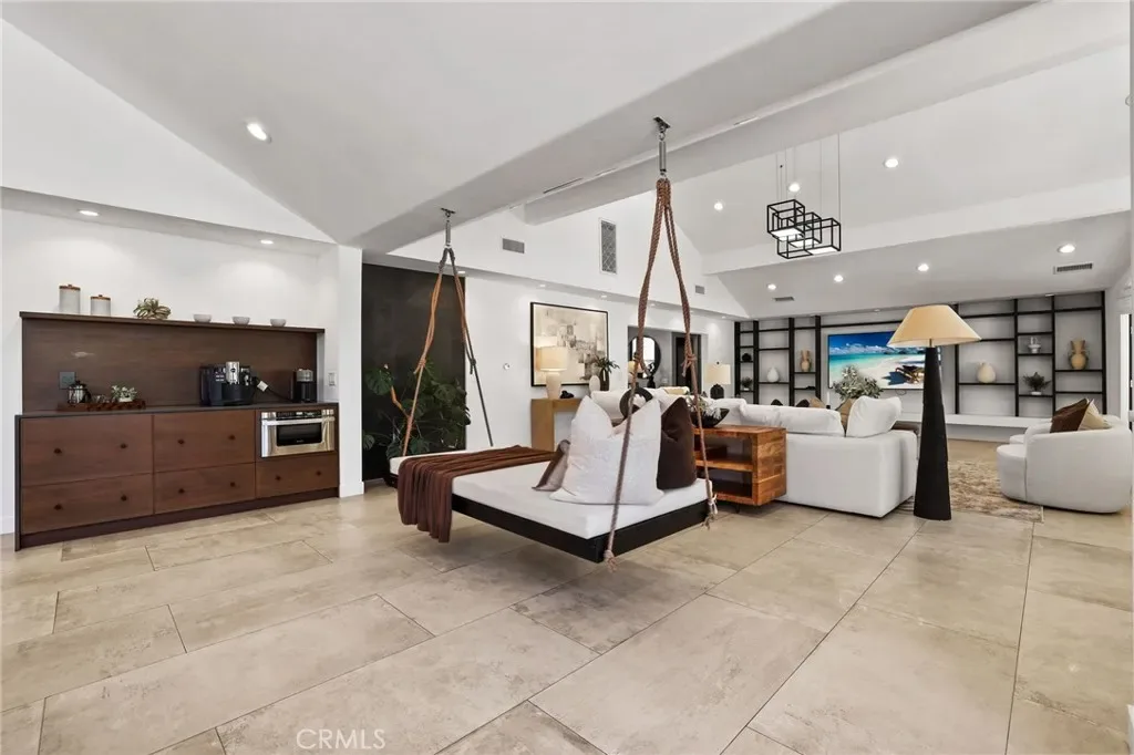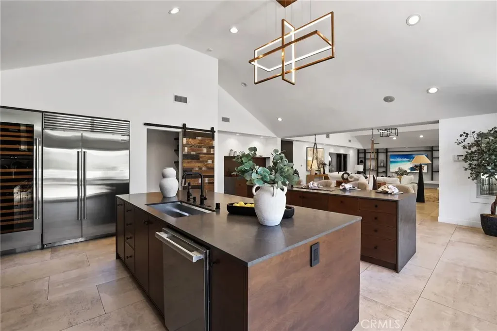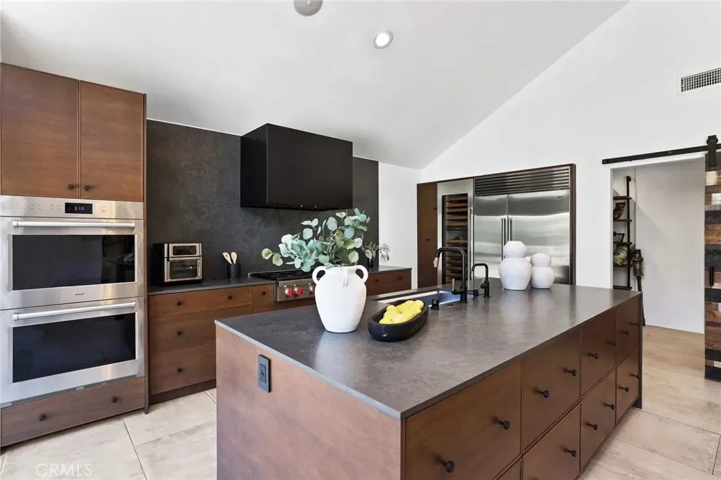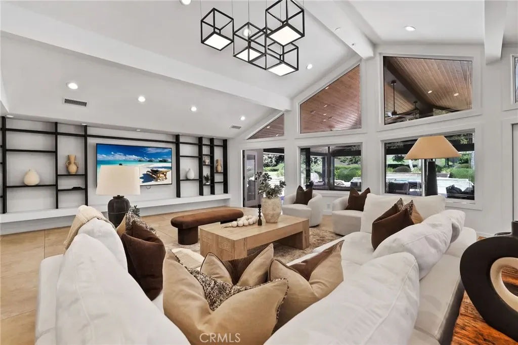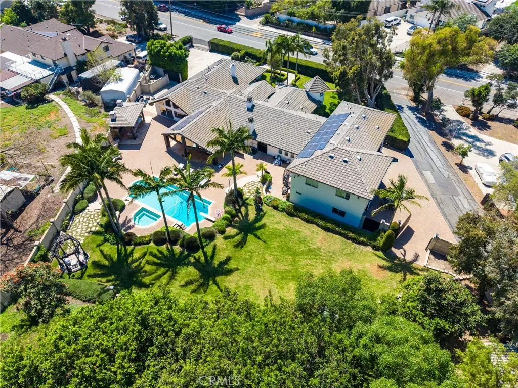 A truly one-of-a-kind single-level estate set on an expansive, flat, and fully usable 37,500+ square foot lot—offering a rare blend of scale, privacy, and lifestyle. The backyard sets the tone for the entire property—an immersive, resort-inspired retreat designed to elevate everyday living. A striking pool and spa serve as the focal point, surrounded by lush, professionally curated landscaping, fruit trees and an impressive motor court with ample space for RV and boat storage. A vaulted, wood-paneled pavilion and built-in BBQ entertainment island create an exceptional setting for hosting, while French doors open to a private casita exclusively accessed from the backyard. Inside the home, a separate staircase leads to a second private casita above the garage, offering both interior and exterior access—each complete with its own kitchen and full bath—seamlessly extending the outdoor living experience. All of this is tucked behind a private motorized gate, creating a grand sense of arrival that feels both exclusive and effortless. Inside, approximately 7,082 square feet of thoughtfully designed living space unfolds with a focus on scale, light, and architectural intention. The open-concept layout flows effortlessly through the main living areas, anchored by a showstopping, architecturally designed kitchen featuring dual oversized islands, bespoke flat-panel cabinetry, new professional-grade appliances, and sleek modern finishes. Walls of glass invite abundant natural light while blurring the line between indoor and outdoor living. Rich materiality defines the interiors, with custom stone accents, matte porcelain flooring, and soaring ceilings that create a warm yet contemporary aesthetic. Designed for flexibility and longevity, the home offers dual primary suites—one featuring a fireplace—along with two private casitas: one with exclusive exterior access and another above the four-car garage with both interior and exterior entry, each complete with its own kitchen and full bath. A library and additional ensuite bedrooms further enhance the home’s versatility. Complete with a state-of-the-art security system and perimeter cameras, the property offers both privacy and peace of mind. Ideally located moments from Crawford Canyon Park, this exceptional estate delivers a rare combination of presence, design, and resort-style living in one of North Tustin’s most sought-after neighborhoods.