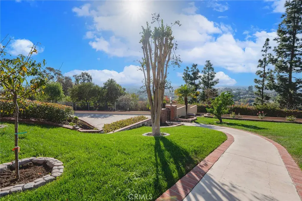 Welcome to Casa de Griffin! You’re on top of the world inside this Spanish Style custom home built in 1988, located in coveted Lemon Heights neighborhood in North Tustin at the top of Foothill Ave. Starting from the outside, you have a beautifully maintained lawn on the south and west wide with pathways weaving in-between. You enter your home starting from a gated driveway as you go up either by bricked capped steps to your front porch, or pull into your ground level garage and head up a flight of stairs to your porcelain marbled floor foyer. From the foyer on your left, a family room with beamed ceilings, gas fireplace featuring a marble front with a wood mantle, with a porcelain marble floor outlined with wood accents. To the right of the foyer, a living room with 2 sliding wood glass doors leading to the side seating patio. Connected to the living room, a formal dining room that is just off the kitchen. The kitchen features custom cabinets topped with marble and a powered center island. You have a built-in gas stove with overhead range hood, dishwasher and a built-in oven. Off the hallway coming out of the kitchen, a convenient half bathroom, in addition to a sitting room in the center of the home with an additional room to the right, both have glass sliding doors out to the red paver patio on the west side of the house. Up the staircase, the primary bedroom with access to the 2nd story patio overlooking West Tustin and beyond. You have an ensuite bathroom with tile flooring, walk-in closet, dual vanity sink, walk-in shower, and seperate tub. Down the hallway you have 2 additional bedroom, both with closets and stellar window views. Each bedroom has an attached full bathroom. On the 2nd level you have a dedicated laundry room with washer/dryer hookups, utility sink, overhead cabinets and a storage closet. The casita in the backyard features porcelain marble floors, a full bathroom with shower tub and a kitchenette that is open to the living area with white cabinets. Lastly, the exterior is accented with manicured trees, rose bushes, hedges, and emerald green grass. This is one of the best locations, at the end of Skyline!