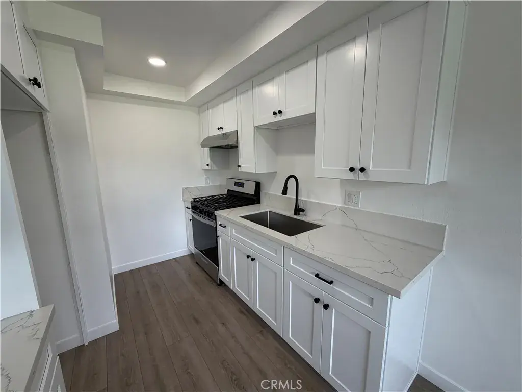 Charming, fully upgraded one-bedroom, one-bath lower-level unit with a private patio in the gated community of Bristol Place. This light and bright home has been completely renovated and freshly painted throughout. Upgrades include new laminate flooring and baseboards, dual-pane windows with blinds, glass sliding door, recessed lighting, a ceiling fan with remote, closet doors, and all new fixtures, outlets, and hardware. The updated kitchen features white shaker cabinets with soft-close doors and drawers, quartz countertops, a stainless-steel sink, gas range with hood and light, garbage disposal, and modern faucet—perfect for both everyday living and entertaining. The remodeled bathroom offers quartz countertops, a soaking tub, a new vanity with soft-close doors and drawers, updated shower fixtures, a single-flush toilet, new lighting, and a medicine cabinet. The unit includes one assigned carport space plus one additional unassigned parking space. Community amenities include a pool, laundry room, and outdoor cooking area with picnic tables. Conveniently located near shopping, public transportation, and easy freeway access.