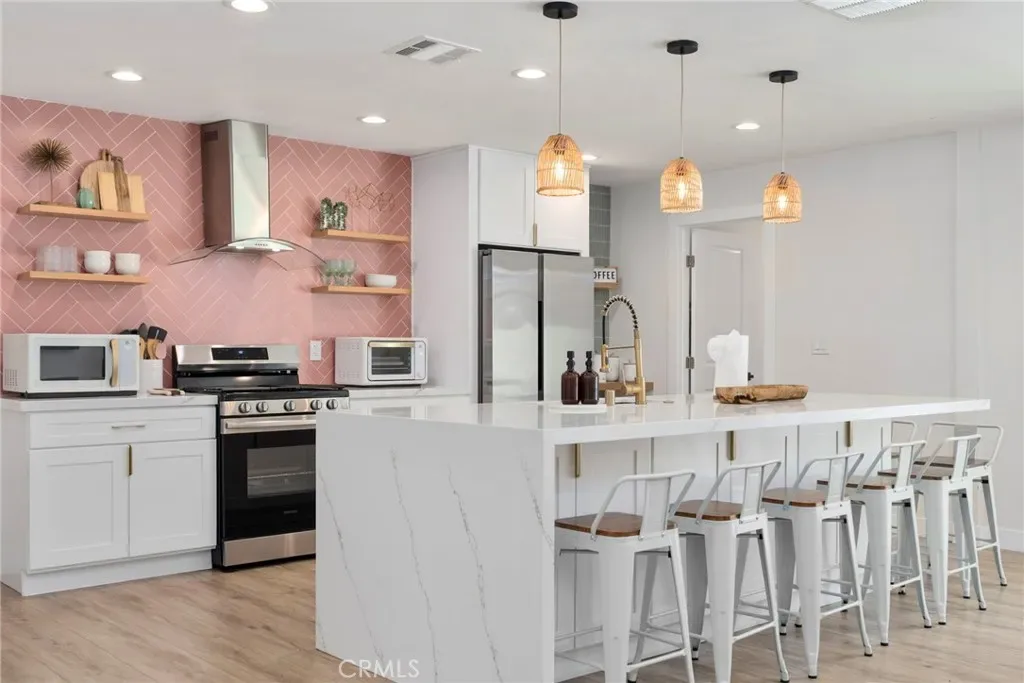 Inside, you’ll find open and inviting living spaces with new laminate flooring throughout. The gourmet kitchen is equipped with quartz countertops, stainless steel appliances, and a built-in coffee bar, creating the perfect setting for both daily living and entertaining. All bathrooms have been elegantly updated with custom tile work and high-end finishes, while new lighting enhances the warm and inviting atmosphere.