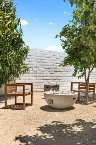The backyard serves as a private retreat, featuring a completely refinished pool surrounded by manicured landscaping, fruit trees, and decomposed granite pathways framed by privacy hedges.
