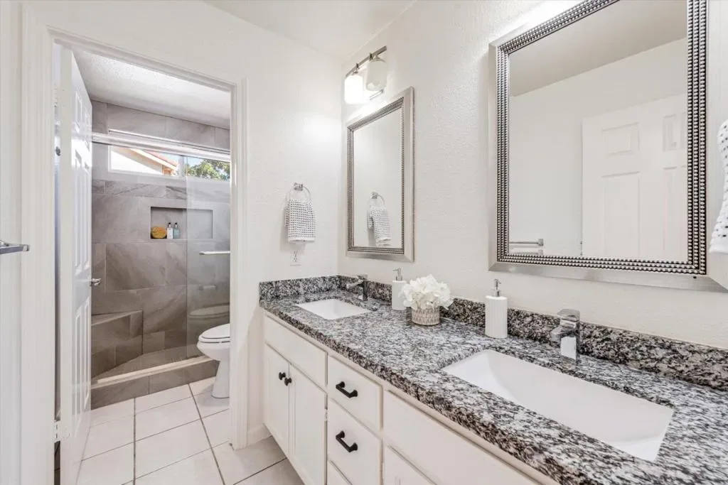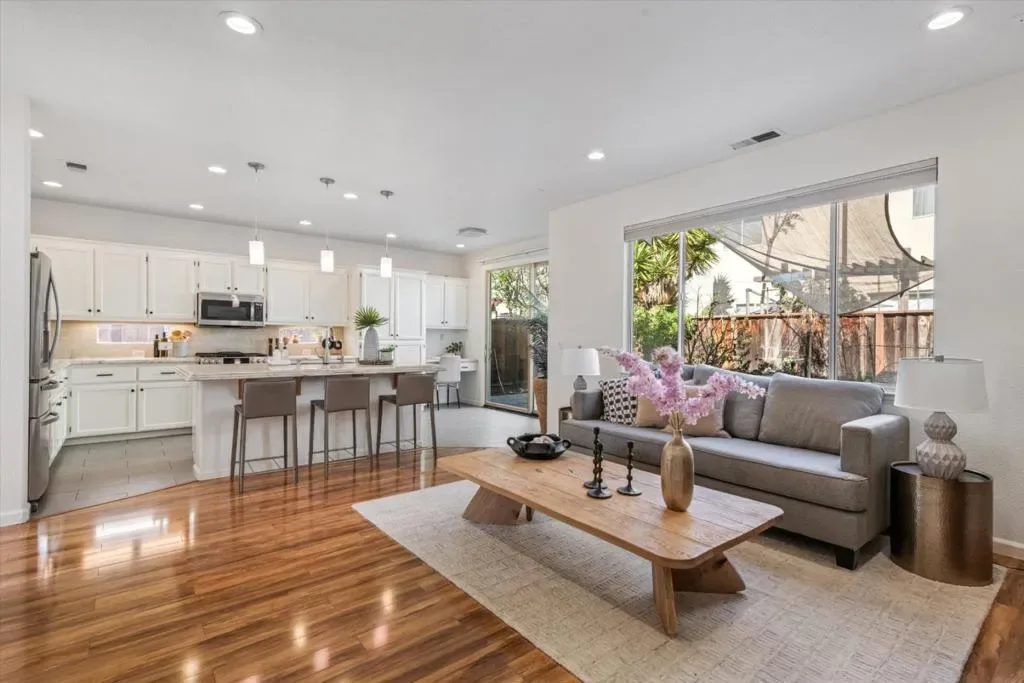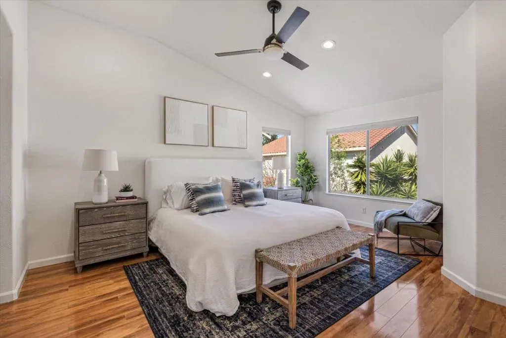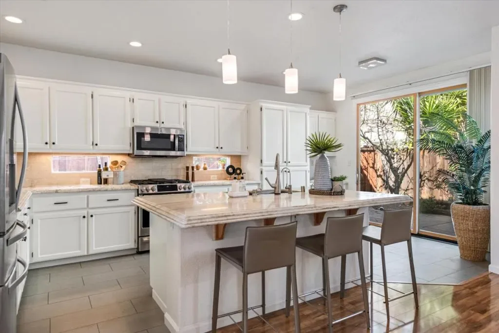 Highly Desirable Mission Park Largest Floor Plan! Welcome to this spacious and beautifully updated home featuring soaring vaulted ceilings in the living and formal dining rooms, creating an open, light-filled atmosphere. Remodeled kitchen showcases stainless steel appliances, elegant Taj Mahal stone countertops, center island with sink perfect for both everyday living and entertaining. A highly sought-after main-level bedroom and full bathroom provide flexibility for guests or multigenerational living. The home is enhanced by gorgeous laminate wood flooring throughout and a large family room with a cozy gas-burning fireplace. Upstairs 3 bedrooms plus a versatile loft that can easily be converted into a fifth bedroom. The luxurious primary suite features a remodeled bathroom and a spacious walk-in closet. Additional highlights include 2nd floor laundry, fresh interior paint, and a beautifully designed backyard with a retaining wall and stamped concrete ideal for outdoor entertaining. Home has a 2 car driveway & on street parking, Enjoy a prime location walking distance to Fuller Street Park and community pool, & just minutes from Rivermark Plaza, major tech employers like Nvidia, Cisco, Broadcom, Palo Alto Networks, Levis Stadium, Sutter Urgent Care, Easy access to Hwy 237&101