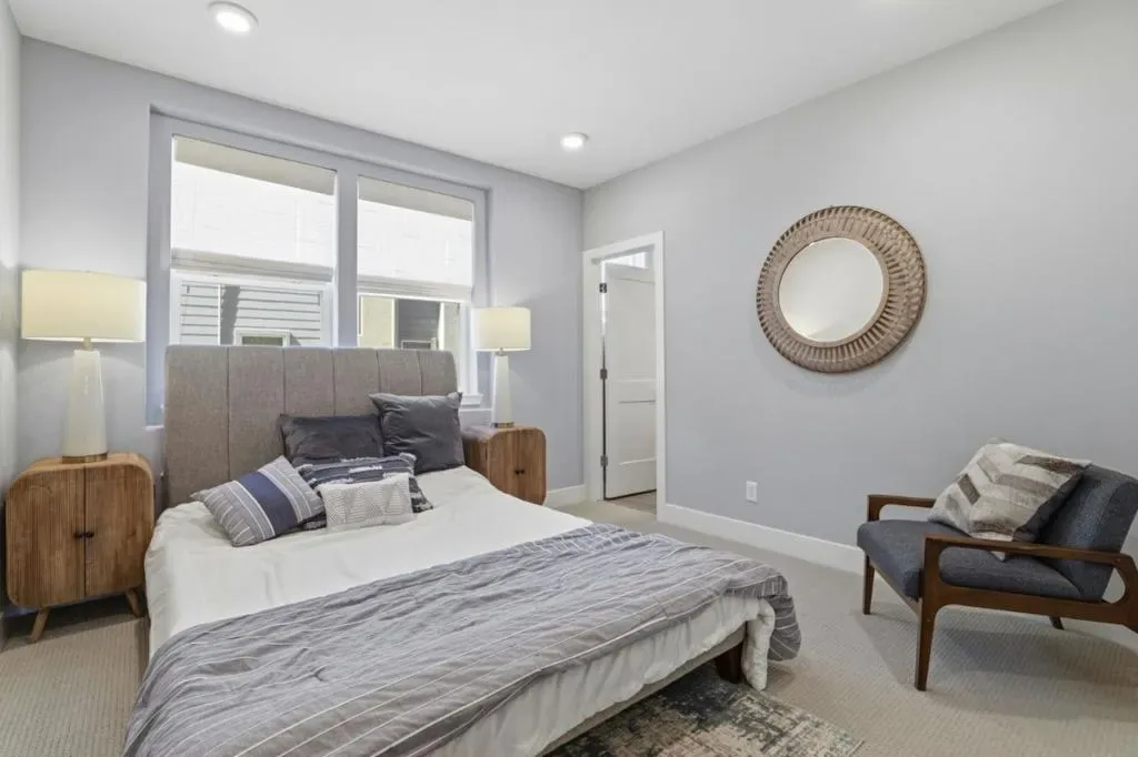 FULLY TURNKEY and SOLD FULLY FURNISHED – this is not staging. This private corner-lot former Toll Brothers model home includes designer-selected furniture, décor, artwork, an OWNED 9-panel solar system, and over $200K in upgrades, with rare privacy and no direct neighbors on three sides. The sunlit main level offers an open-concept layout connecting the designer kitchen, living room, office nook, and dining area, plus a covered balcony. High ceilings, designer lighting, hardwood floors, quartz slab countertops, a white brick tile backsplash, slate-panel cabinetry, a massive island, a KitchenAid range, and a built-in refrigerator elevate the space. Both spacious suites feature modern en-suite baths, including a luxurious primary with double vanity, walk-in shower, and walk-in closet. Additional highlights include a powder room, an attached 2-car garage, a laundry area, a tankless water heater, and smart controls. Enjoy low Santa Clara utilities and a prime location near Costco, Whole Foods, Lawrence Caltrain, NVIDIA/Apple/Google/Meta, and easy freeway access.