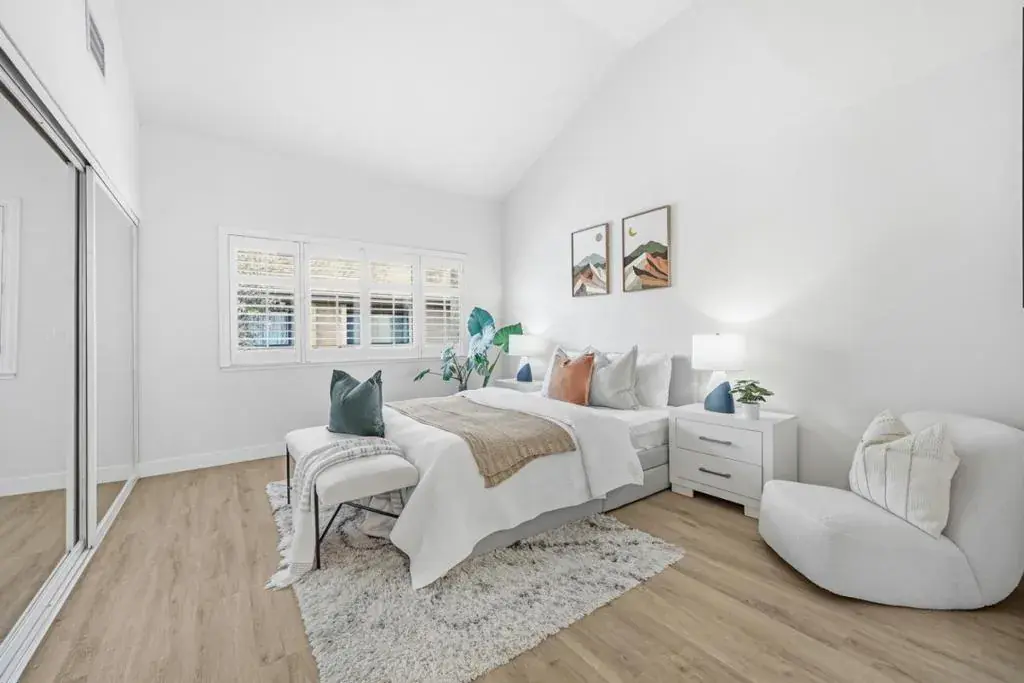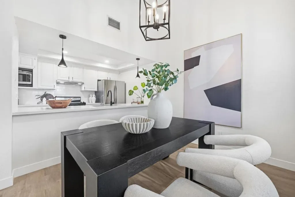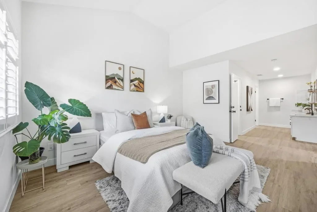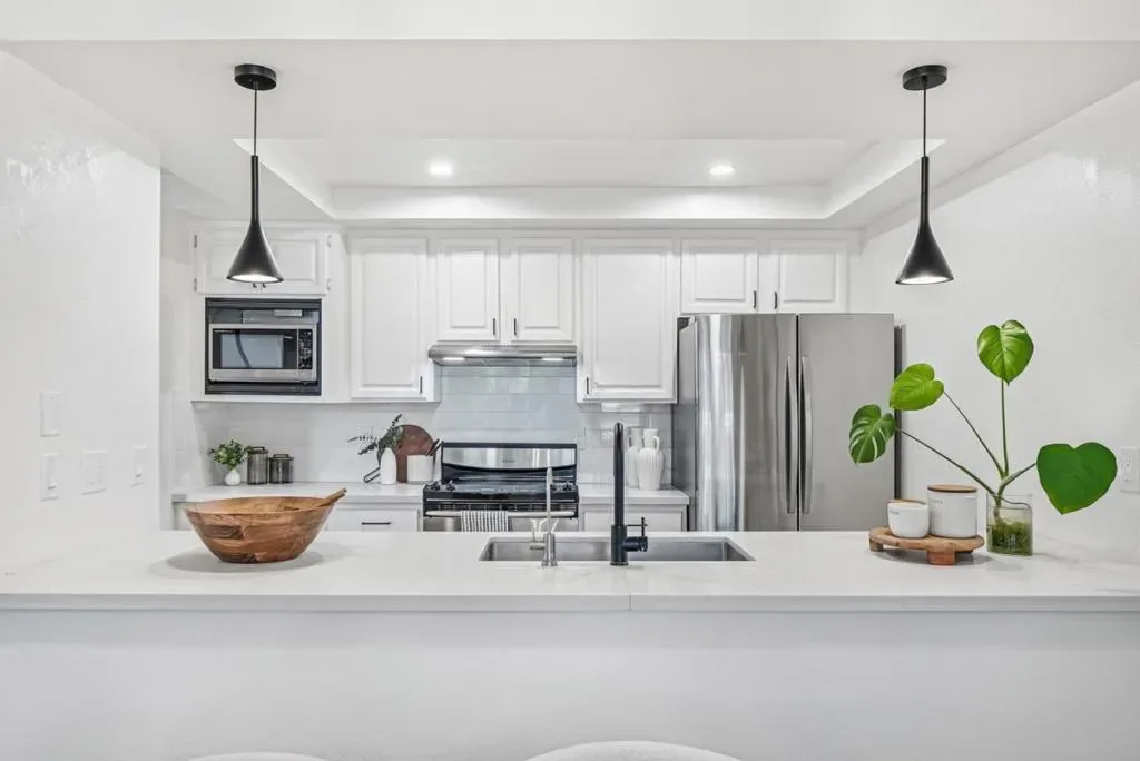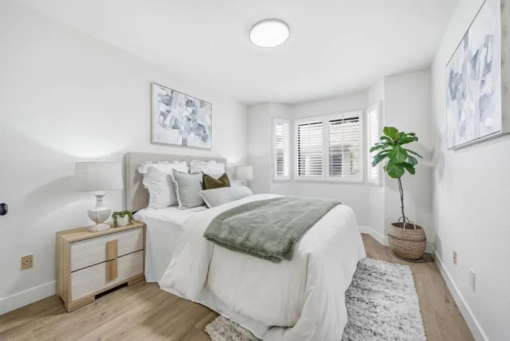 Stunning End-Unit with Private entrance in the prestigious Miramar Terrace gated community! Fully remodeled in 2021, this bright and spacious home features an open living/dining area with high ceilings and tons of natural light, leading to a large private balcony. The remodeled kitchen boasts quartz countertops, beautiful backsplash, white shaker cabinets, and SS appliances. Bathrooms are upgraded with sleek fixtures, quartz counters, and designer tile. The Expansive master suite offers vaulted ceiling, dual closets, and dual-sink vanity. Second bedroom includes walk-in closet. Additional highlights include recessed lighting, plantation shutters, central A/C, in-unit laundry, and extra storage unit. Two parking spaces plus ample guest parking. HOA covers water, gated entry, security patrols, garbage, gas, and amenities including pool, spa, clubhouse, sauna, and gym. Ideally located in the heart of Santa Clara near Santana Row, Valley Fair, Nob Hill, Ponderosa/Eklund parks, restaurants, and major tech companies.