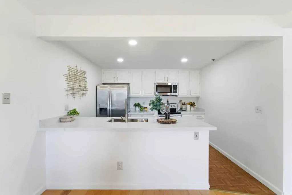 Stunning and Largest unit you will find under $800K. 1456 sq feet is larger than some surrounding single family homes. This gated community keep you from the risks of a carport. This one story unit in gated community with an elevator is the perfect “Roommate Floorplan”- with beds and baths on opposite sides of the unit. Fabulous sought after open concept allows interaction from in kitchen with quartz counters to living & dining rooms. Freshly painted and recessed lights creates a modern vibe. Large windows allows natural light and spacious terrace offer views you can enjoy from a high floor. Primary bedroom is approximately 15′ by 11′ and offers plenty of room for an office space or work out area. Baths have elegant quartz counters, large closets & bathtub/shower. Secondary bedroom is a massive 17′ by 11′ with bay window & walk in closet. Intelligent design means one partial shared walls (see diagram) . Other extras: brand new AC ($12K to install), Full size Washer/ Dryer, Refrigerator, storage closet, elevator, 2 parking spaces, trash chute, low Santa Clara utilities and packages delivered to your door! HOA covers a ton! Hot and Cold water, swimming pool, rec room) and pool table. Easy commute to Apple, Nvidia. Enjoy the peace that a high floor offers.