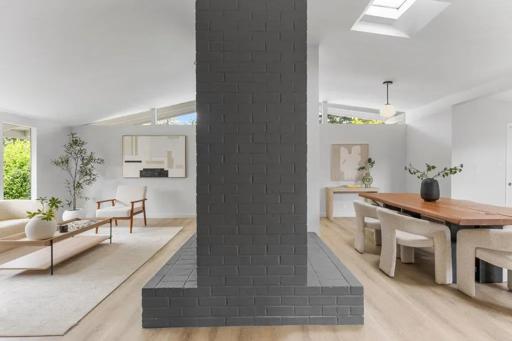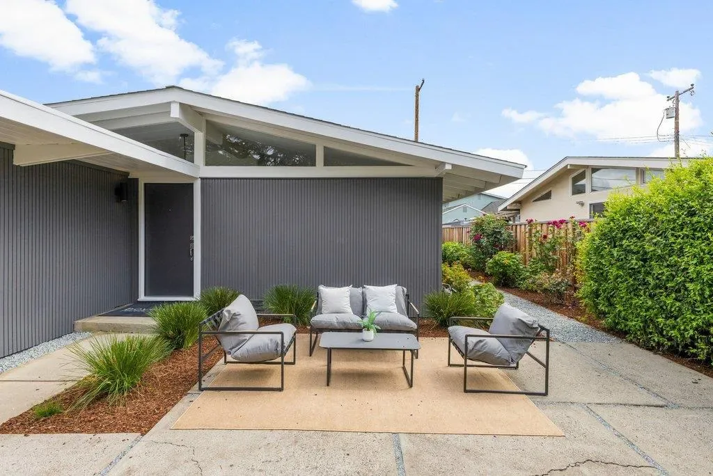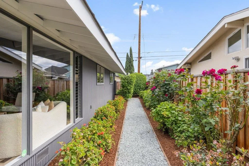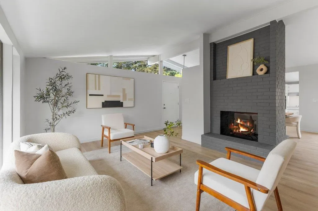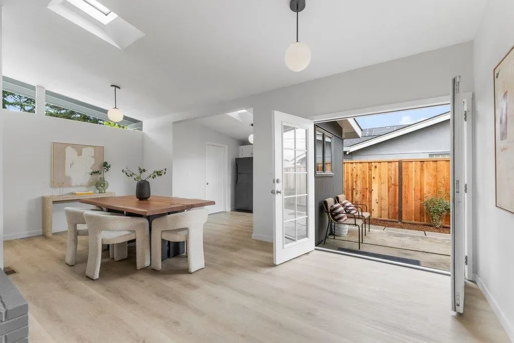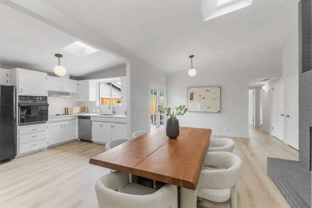 Stunning updated Mackay home in the highly sought-after Maywood Park neighborhood, just steps from Maywood Park and Eisenhower Elementary School. This mid-century modern-inspired home makes an immediate impression with a designer wood garage door, fresh exterior paint, and a new concrete driveway. Inside, natural light fills the open layout, enhanced by transom windows and anchored by a striking double-sided brick fireplace connecting the living and dining areas. The updated kitchen features new quartz countertops, painted cabinetry, modern hardware, and a new electric range with hood. New LVT flooring runs throughout, while refreshed bathrooms include mid-mod inspired vanities, updated mirrors, and contemporary lighting. Outdoor spaces are designed for both relaxation and entertaining, with fresh landscaping, mature plantings, a welcoming courtyard, and side patio. The garage is finished with an epoxy-coated floor for a clean, functional touch. Located in a community known for classic Mackay homes and tree-lined streets, this property also offers access to top Cupertino schools, including Hyde Middle School and Cupertino High. Convenient to Apple, major commute routes, and Santa Clara utilities for added savings, this is a rare blend of style, location, and lifestyle.