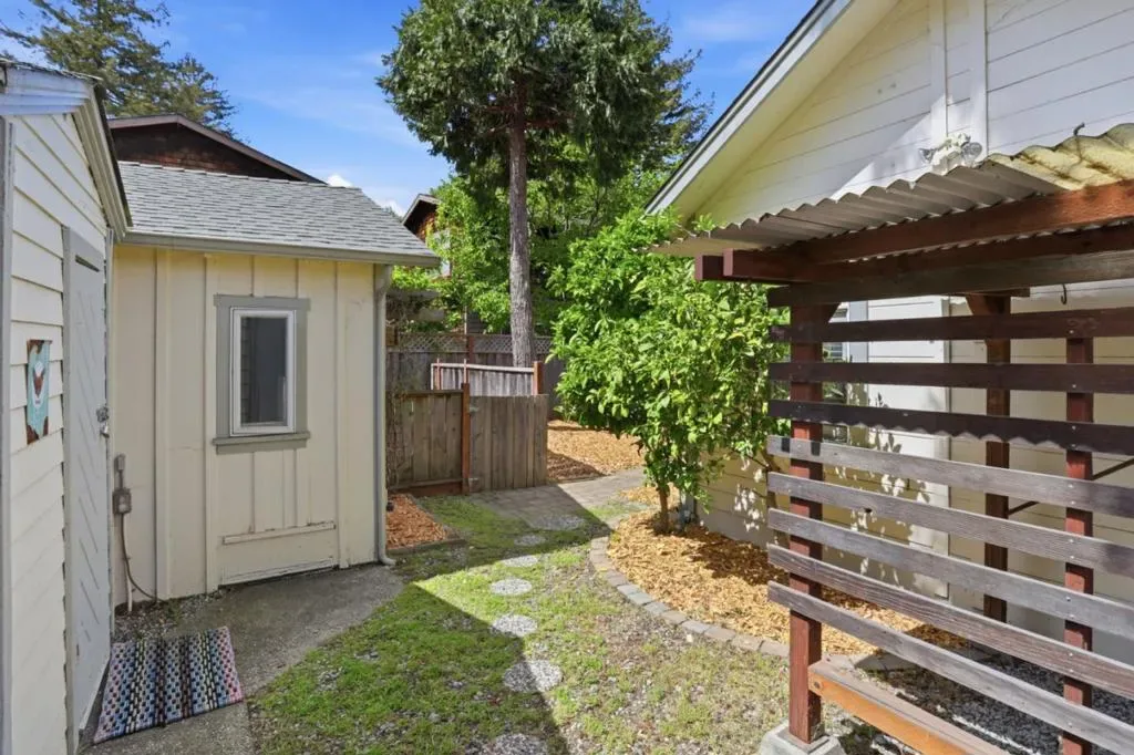Charming Single Story Beach Bungalow in Sunny Santa Cruz, ideally located near UC Santa Cruz, Downtown, beaches, and the Boardwalk. This unique coastal property features an approximate 1056 SF 2-BD/1.5-BA main home plus a detached 320 SF 1BD/1BA garden cottage on a spacious 7,362 SF gated lot. The renovated 1924 bungalow blends classic character with modern comfort, including hardwood floors, plush carpet, fresh interior and exterior paint, original built-ins, updated lighting, a modern gas fireplace, forced-air heating, and a solid roof. An open layout flows seamlessly to decking and concrete patios for easy indoor-outdoor living. A majestic heritage redwood anchors the yard, creating a peaceful coastal setting. The updated kitchen features stainless appliances, tile countertops, a farmhouse sink, new micro-hood, interior laundry and abundant storage. Outdoor spaces include wraparound decks, patios, mature trees, and garden beds. Detached office/guest space, carport with storage, and bonus outbuilding offer flexibility for guests, rental income, or a relaxed coastal retreat.