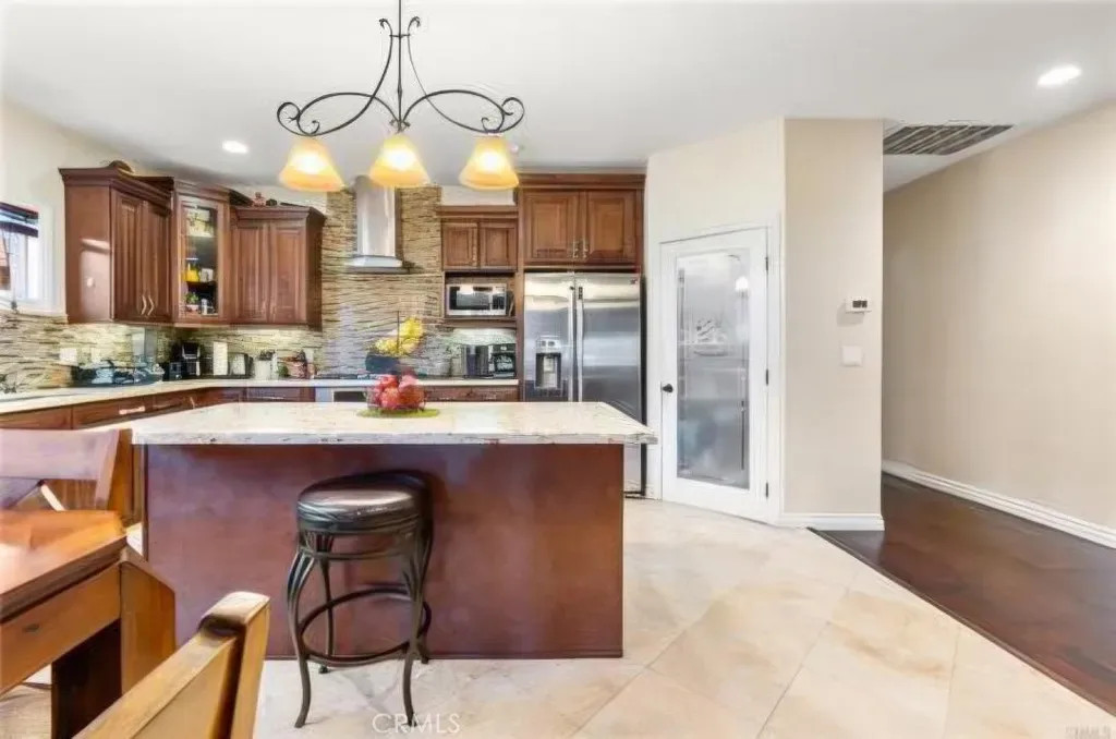 Inside, you’re greeted by rich wood flooring complemented by elegant travertine finishes in the kitchen and bathrooms. The thoughtfully designed open-concept layout centers around a stunning chef’s kitchen, featuring a spacious island, custom cabinetry, designer countertops, eye-catching backsplash, and stainless steel appliances—perfect for everyday living and effortless entertaining. The layout flows naturally into a formal dining area with a cozy fireplace and a generous living room that opens to a large backyard, ideal for gatherings, play, or relaxing evenings outdoors.