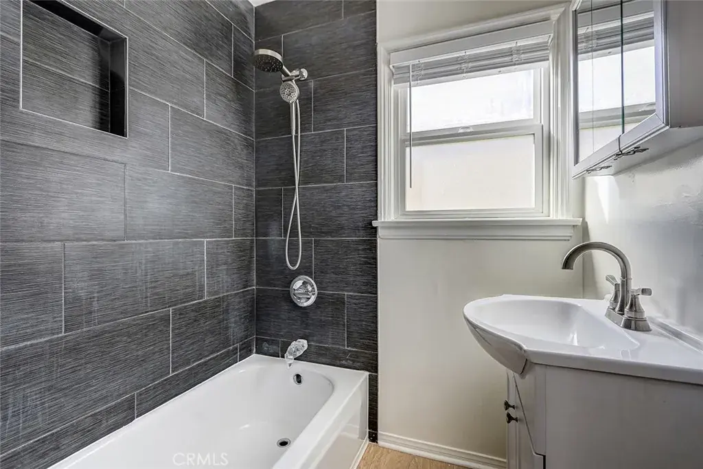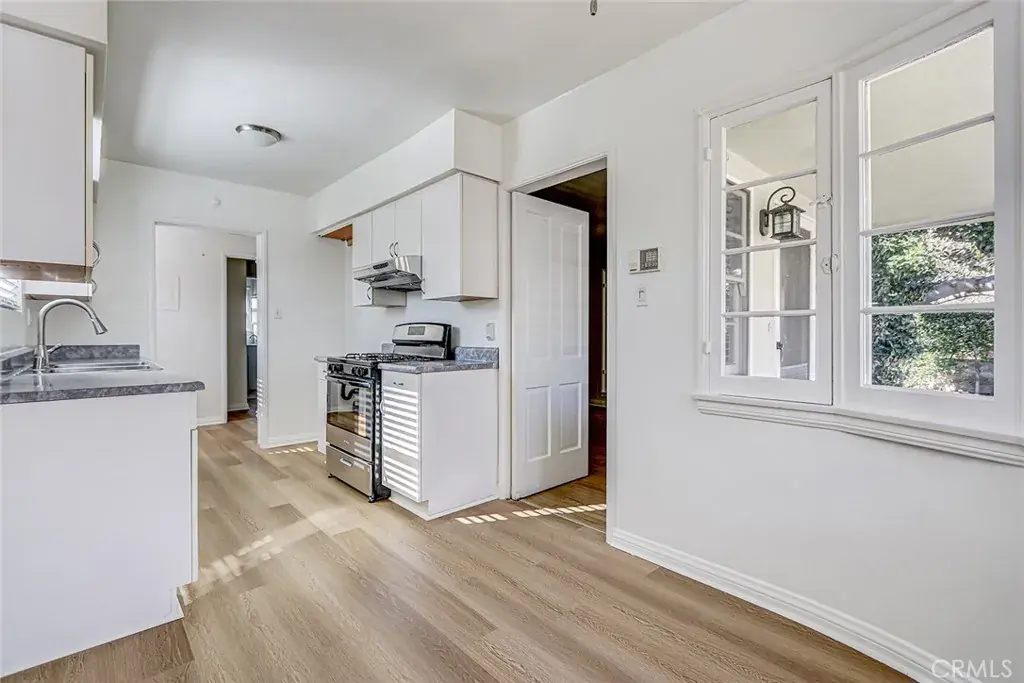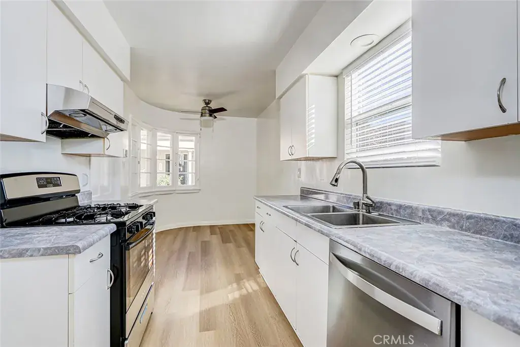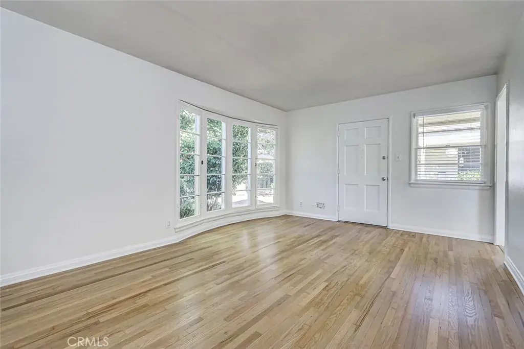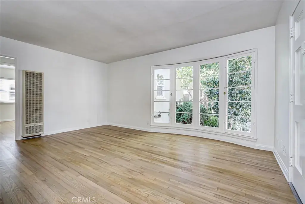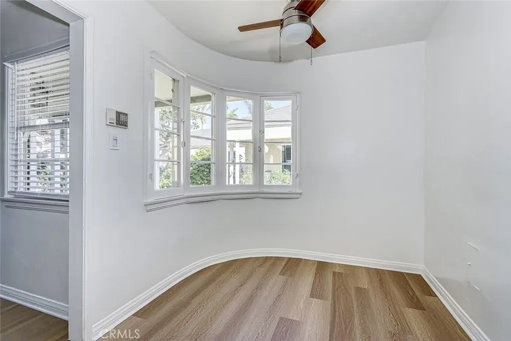 One unit is delivered vacant and is a 2-bedroom, 1-bath residence encompassing approximately 843 square feet. It features hardwood-style laminate flooring, a newly remodeled bathroom with tub, and a charming dining nook accented by a curved window, creating a bright and inviting living space that is highly appealing to both owner-users and tenants.