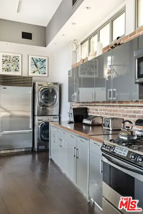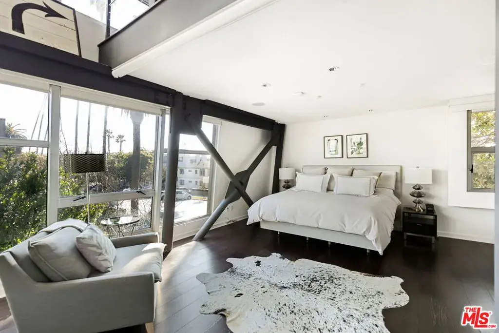 Presenting this special, architectural New York loft-style home in the heart of downtown Santa Monica. Designed by William Dale Brantley using only the finest steel, glass, and brick finishes, this sleek 2 bedroom, 2 bathroom space is timeless. The open floor plan is reminiscent of a fine art gallery, with an abundance of natural light pouring in from the wall of windows. The view embodies a perfect blend of east coast meets west coast, with mature palm trees towering over the cityscape. The fully-equipped kitchen features wood countertops with exposed brick backsplash and stainless steel appliances. The main floor is complete with a full bathroom, guest bedroom or gym, dining room, andformal living room with an 80-inch TV and private patio. The sensational primary suite features a walk-in closet and spa-like bathroom with double vanity, soaking tub and shower. The top level is uniquely set up as a second living area and office, ideal for those looking to work or create from home. Conveniently located walking distance to Santa Monica’s finest restaurants, shops, markets (2 blocks from Trader Joe’s), and the best part of all: 9 blocks from the beach! In-unit laundry and 2 car secure, covered parking. Available now and furnished. With unparalleled quality, style & design, this is the inspired space you have been searching for.