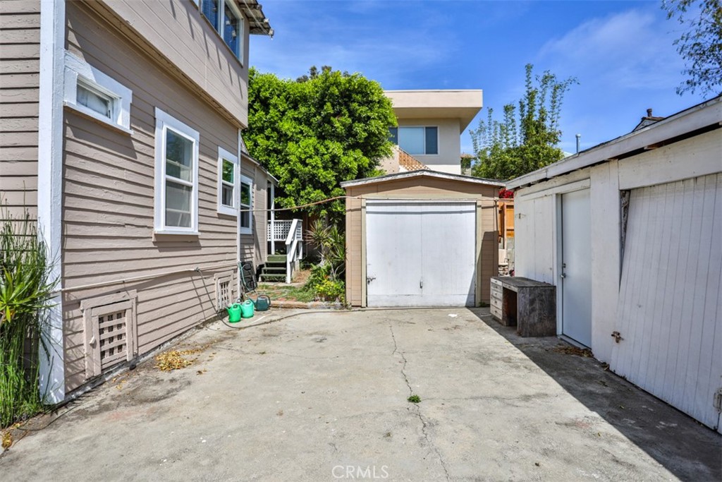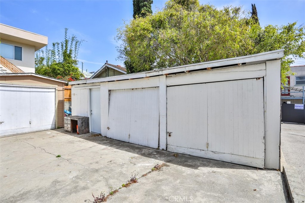 The property includes four detached garages and a shared on-site laundry area. The site layout incorporates a rear patio area adjacent to the garage structure. Buyer to verify potential uses and development standards.