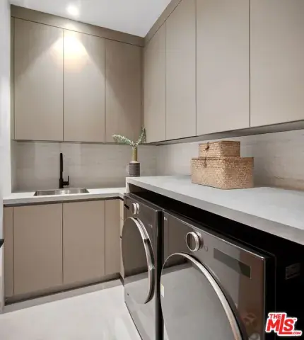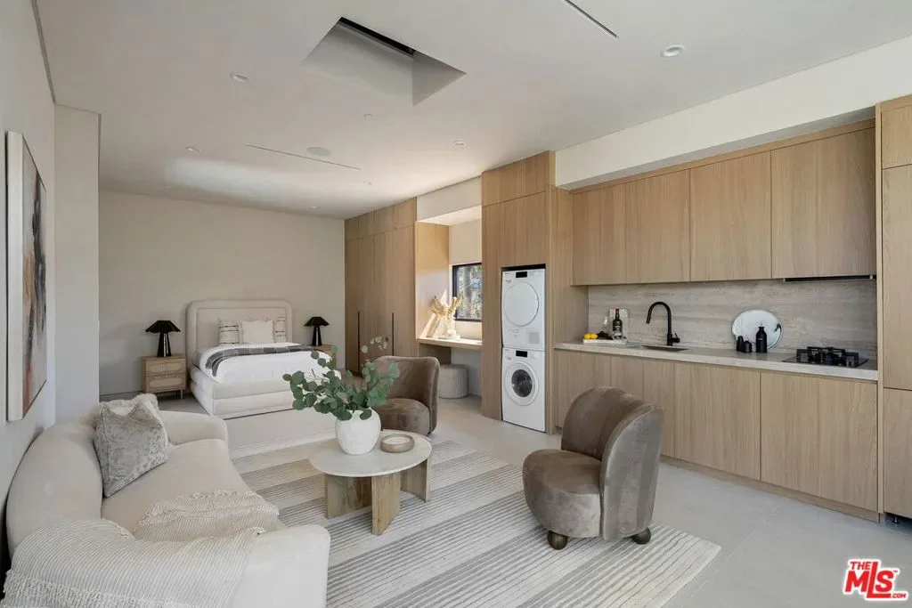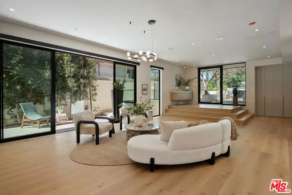 Set behind a canopy of mature olive trees that lend both shade and privacy, this newly built architectural residence spans approximately 7,700 square feet across two levels and a full basement. The main level unfolds with dramatic scale, offering expansive living, dining, and family rooms anchored by a sleek fireplace and framed by soaring floor-to-ceiling windows that flood the interiors with natural light. A flexible office or guest suite with an adjoining three-quarter bath enhances the layout. The gourmet kitchen is a statement in design, appointed with bespoke DOCA cabinetry, quartz countertops, a professional 6-burner cooktop with hood, Miele double ovens, wine refrigerator, beverage center, microwave, and a generous sized pantry. Upstairs, three spacious en-suite bedrooms include a tranquil primary suite featuring a fireplace, private balcony, custom oversized closet, dual sinks, freestanding soaking tub, and a luxurious rain shower. A serene hallway patio and a second laundry room add both style and convenience. The lower level is dedicated to leisure and wellness, boasting a state-of-the-art theater, fitness studio, wet bar, sauna, steam shower, bedroom with en-suite bath, custom built-ins, and a refined fireplace. Outdoors, the resort-style backyard is designed for entertaining with a sparkling pool and spa, barbecue island, mini-fridge, and a two-car garage. A private junior ADU suite offers further versatility with a kitchenette, stacked washer/dryer, three-quarter bath, balcony, and dramatic floor-to-ceiling windows. Additional highlights include wide-plank hardwood and stone flooring throughout, elevator access to all levels, and a fully integrated Crestron smart home system. Located on one of Santa Monica s most desirable streets, just moments from Palisades Park, the beach, fine dining, and luxury shopping.