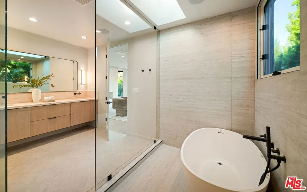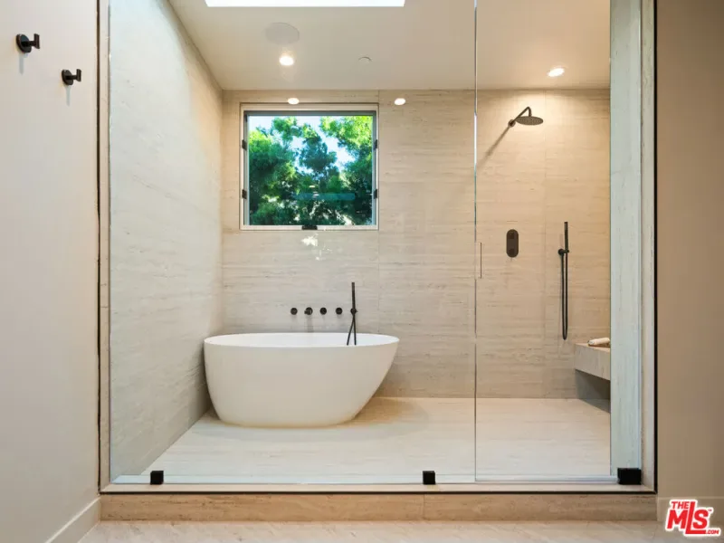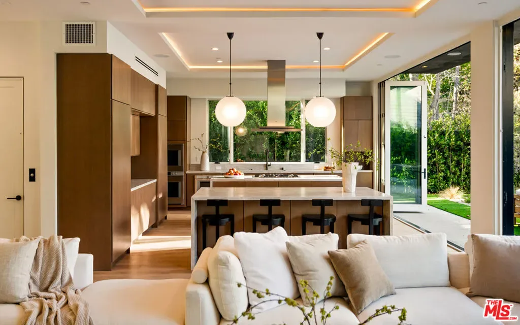 Newly completed following an extensive six-month renovation and offered for the first time, this North of Montana residence pairs disciplined modern architecture with a fully realized amenity program and exceptional indooroutdoor flow. The home spans three thoughtfully planned levels with private elevator access, delivering scale, privacy, and seamless functionality for both daily living and large-format entertaining. The main residence includes five bedrooms and seven bathrooms with expansive open-concept living and dining areas framed by oversized glazing and folding glass walls. Light moves through the home from multiple exposures, enhanced by clean ceiling lines, skylights, and wide-plank flooring that carries a consistent, warm modern palette throughout. At the center, a double-island chef’s kitchen is finished in Taj Mahal quartzite with top-tier appliances and integrated storage, opening directly to the primary living spaces and exterior terraces for effortless hosting. Interiors are defined by refined material continuity and architectural restraint, including four limestone fireplaces, a newly executed primary bath, a custom-designed closet, and a redesigned powder room. Large picture windows capture garden views and mature greenery with beautiful olive trees, creating a calm, gallery-like backdrop across living areas and bedrooms. A comprehensive lower level includes a private movie theater, fully equipped gym, wine cellar and meditation room forming a true at-home retreat across multiple levels. The exterior is designed as a direct extension of the interior program: folding glass doors open to landscaped grounds with a pool and spa, an eight-jet water feature, integrated LED lighting, an outdoor fireplace, multiple lounge zones, and grassy play areas. Newly installed landscaping and mature olive trees provide structure and privacy, while the overall plan supports both relaxed daily use and entertaining at scale. Additional highlights include an expansive rooftop deck with ocean views and a 1,050-square-foot two-story ADU complete with two bedrooms, one and a half bathrooms, with living room, kitchen, and in-unit washer/dryer ideal for extended stays, guests, staff, or flexible work-from-home living. A newly completed, design-forward offering in one Santa Monica’s most established and sought-after neighborhood.