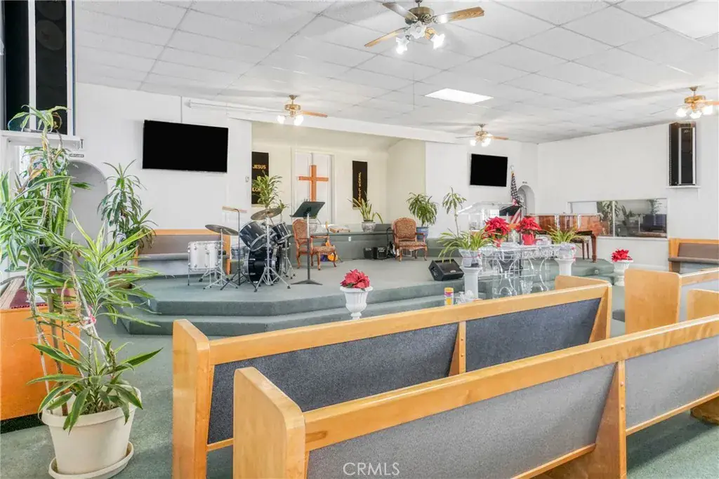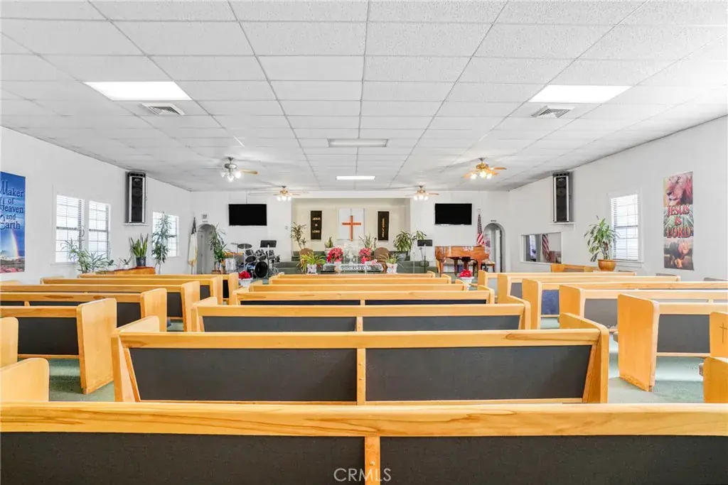 area down stairs , which includes a spacious assembly/community area dining, suitable for congregation gatherings, meetings, or events. Per the