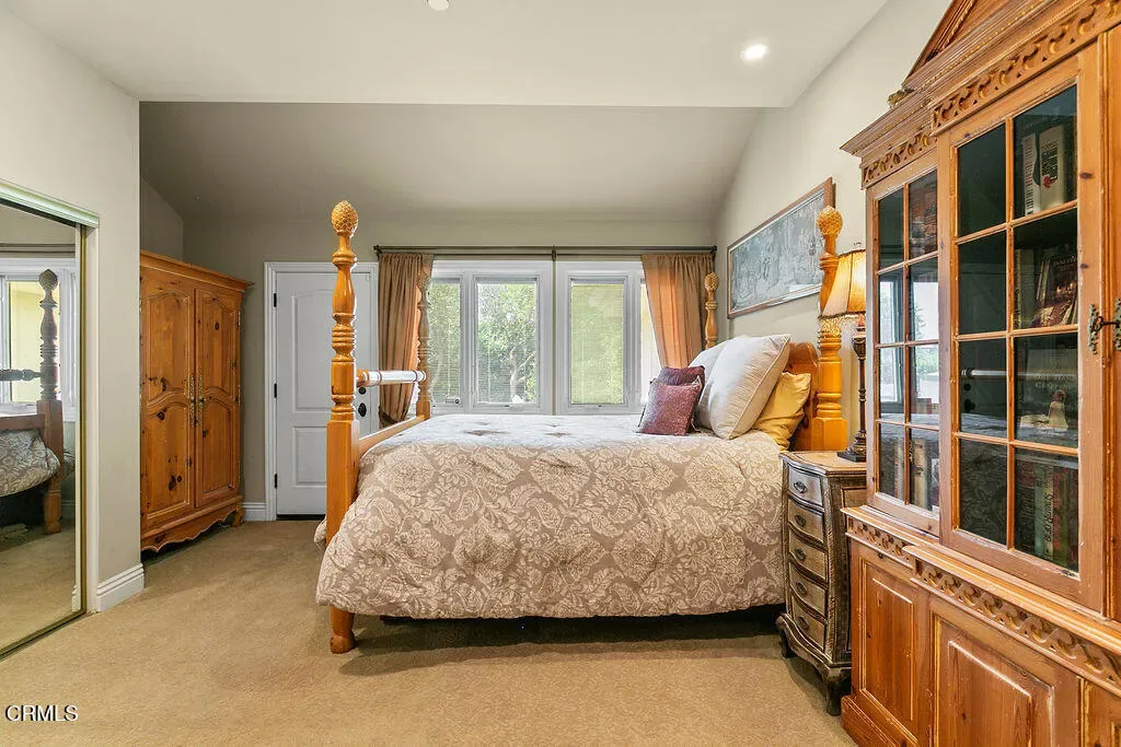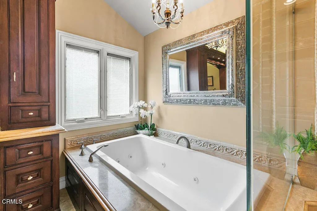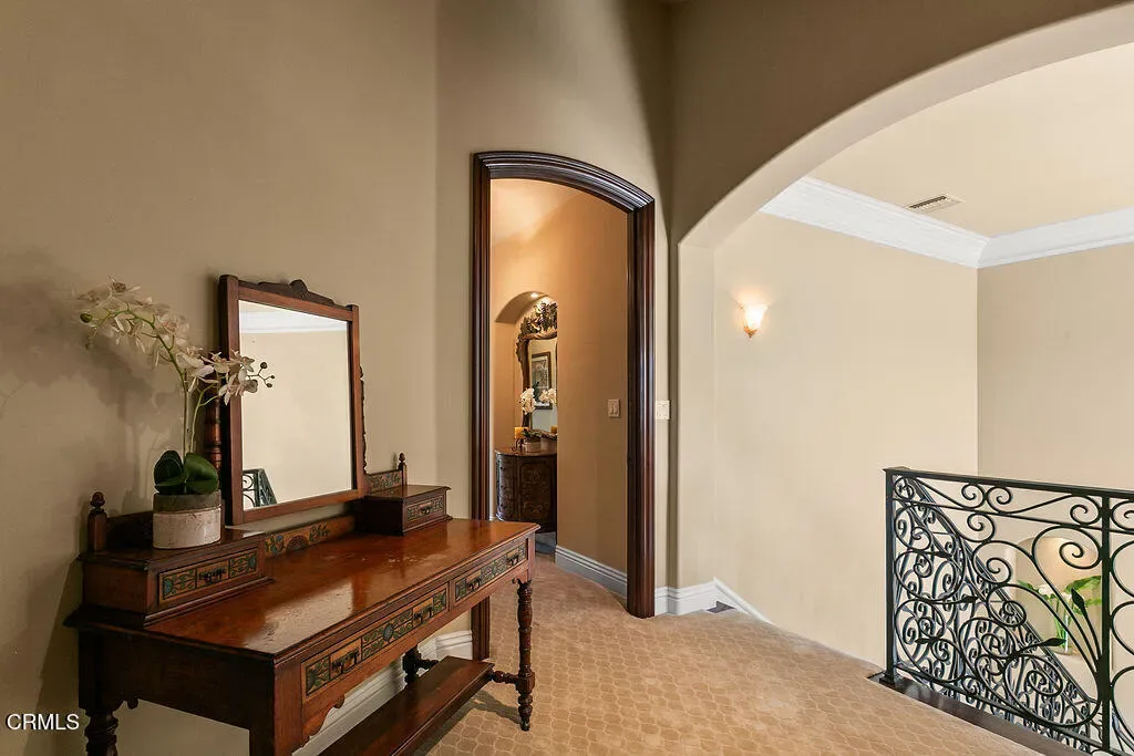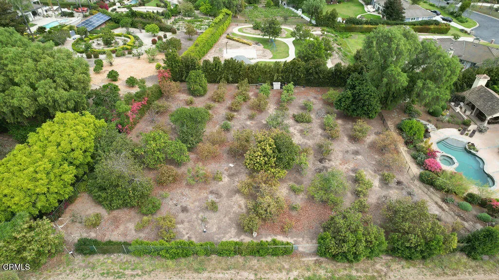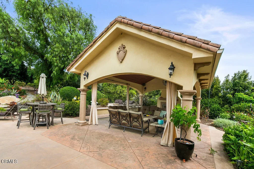Rancho Las Brisas Estate Private Vineyard, Orchard & Resort Living in Santa Rosa Valley.Tucked behind gates of an intimate 25-home enclave of long-standing residents, this extraordinary estate offers a rare sense of community, privacy,& tranquility.Set on a secluded flag lot, a cobblestone driveway lined with fruitless olive trees leads to a residence designed for seamless indoor-outdoor living.This French Mediterranean-inspired estate features 5 bedrooms and 4 bathrooms, offering timeless elegance paired with exceptional craftsmanship. Inside, rich walnut wood flooring, travertine with inlaid mosaic details, crown moldings, wainscoting, and custom millwork create a warm yet sophisticated environment. 3 fireplaces, solid wood doors, Pella windows & French doors w/built-in blinds. Designed for both everyday comfort & entertaining, the home includes expansive living and dining areas, a welcoming family room, and a game room with wet bar and refrigerator. Hidden rope lighting, architectural ceiling details, and custom finishes enhance the ambiance throughout. The gourmet kitchen is a true centerpiece, featuring double Miele ovens, Sub-Zero refrigerator/freezer, 2 dishwashers, trash compactor, granite countertops, & oversized island w/ abundant storage & prep space. Butler’s pantry w/beverage refrigerator, pullout storage, wine racks, along with dedicated wine room w/custom wine box wall, make this home ideal for entertaining. The primary suite is a luxurious retreat, complete w/ double-sided fireplace shared with a sitting room, domed ceilings, French doors opening to a private balcony. The spa-like bath includes a Jacuzzi tub, stone countertops, and refined lighting details.Resort-style setting. The grounds feature a sparkling pool, spa, and tranquil koi pond, surrounded by mature, drought-tolerant landscaping. Multiple outdoor living areas include covered patio and a stunning cabana with cast-concrete architectural elements, gas fireplace, and hookups for TV/audio.Fully equipped outdoor kitchen incl a stunning exposed wood beam ceiling, gas grill, wood-burning BBQs, & refrigerator.Adding to the property’s uniqueness is a flourishing orchard with avocados, citrus, macadamia nuts, cherimoya, &additional fruit trees, along with established vineyard producing its first vintage, featuring 70 Cabernet Sauvignon vines and 4 Merlot vines, offering rare opportunity to enjoy a true farm-to-table and vineyard lifestyle.