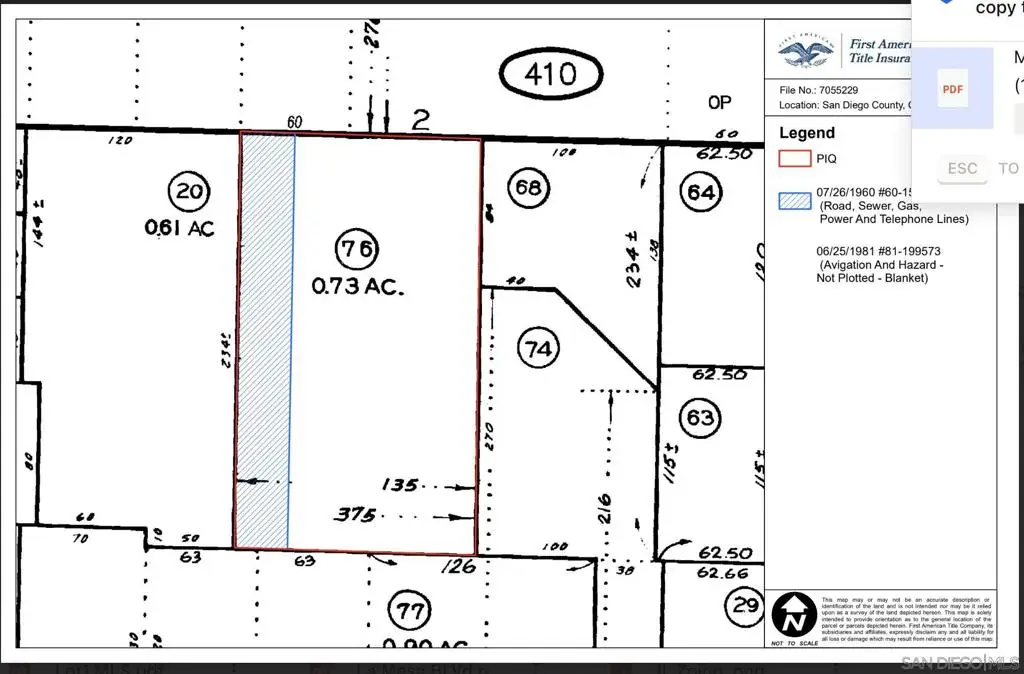 **Prime Commercial Land Opportunity in San Diego County** Discover a rare investment opportunity in San Diego County! We present two commercial parcels, each with a potential high cap rate for land development. The FAA has a preliminary approval approved for storage/equipment parking use on these vacant lots, totaling 1.34 acres. **Key Features:** – Parcel 1 (APN 384-410-76-00): 31,798 sq. ft. – Parcel 2 (APN 3385-410-20-00): 26,571 sq. ft. – FAA Preliminary Approval for Storage Use – Gillespie Field Overlay Zone – Light Industrial Zoning – Triple Net Lease Option: $8,500 for both parcels – Individual Parcel Lease Rates: $3,719 (Parcel 1) and $4,451 (Parcel 2) – Convenient Ingress and Egress on West Side (East May be Availble) **Additional Information:** – The adjacent parcel, grandfathered for two single-family residences, may be available for sale. Call the Agent for details and/or to submit an offer. – Located in the Gillespie Field Compatibility Zone, ensuring strategic development. – Check the Gillespie Community Land Use Plan (Page 32), and Gillespie Field Compatibility Plan (Pages 71-72, 107-112) for detailed zoning insights. **Sales Details:** – Total Sales Price: $899,900 – Acreage: 1.34 acres (58,369 sq. ft.) **Important Notes:** – No structures can be built under the Gillespie Community Land Use Plan and avigation easement on this particular property. – Verify all information with the FAA, the County of San Diego, and the city of Santee for approvals.