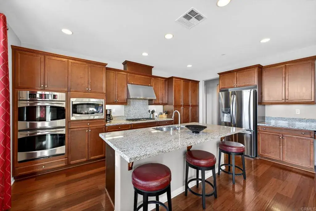 Nestled within the exclusive community of Sky Ranch well above the city of Santee, this original owner, turnkey single level home is set along a quiet, picturesque street, that lives up to its name, offering beautiful surroundings, well planned design with a panoramic view of city lights and stunning sunsets. This ranch-style residence epitomizes Southern California living at its finest. This home spans approximately 3,003 square feet and features a thoughtful layout with four bedrooms and three full bathrooms, offering both comfort and style for everyday living or festive entertaining. Built in 2013, the property showcases true California style architectural amidst a quiet neighborhood. The fully landscaped lot with palms, turf, a huge plumeria tree and drought tolerant areas offers privacy and is fully irrigated, full drip system front and back yard and slope is sprinklers. All on timers. There is room for a garden, dog run, or elegant entertaining under the California sun or sunset happy hours and quiet mornings with coffee. Inside, the well-proportioned rooms are infused with natural light and flow effortlessly from room to room, creating an inviting sense of home. The foyer opens to a wide hallway leading to the main living area. An open and inviting common area features a kitchen with a huge island complete with bar seating, granite, stainless and dark wood cabinetry with an adjacent large formal dining room. The formal dining room could alternatively be used as a game room, office, home gym or hobby area. Additionally, it could be converted to another bedroom. The well thought out floor plan balances privacy with proximity with an impressive primary bedroom including a large bath and generous walk-in closet. The primary bath features a custom tiled shower and separate large soaking tub and dual sinks. The second bedroom/office is adjacent to the guest bath. The third and fourth bedrooms are connected by an entry with storage. They are joined by a jack and jill bath complete with dual sinks on the opposite side of the home from the primary suite for privacy. Additional features include owned solar and a large pantry area for extra kitchen storage. Tri-zone climate control for personalized comfort and energy conservation. The home features ceiling fans in every room and recessed canned lighting with dimmable controls. The oversized laundry room is conveniently located outside the primary suite. Key pad controlled smart door locks are located on the front door and garage door for convenience and security. The large three-car garage has a tandem space that could be used as a workshop, craft area or general storage. Gorgeous neighborhood ideal for walking and hiking. Dog-friendly community with regular activities including taco nights and holiday celebrations. Convenient access to freeways 67, 52, and 8 (just 5 minutes away). Situated close to well-regarded schools, lush parks, and local amenities, this home embodies the desirable blend of suburban tranquility and everyday accessibility that defines Sky Ranch living