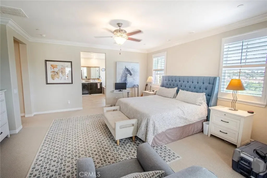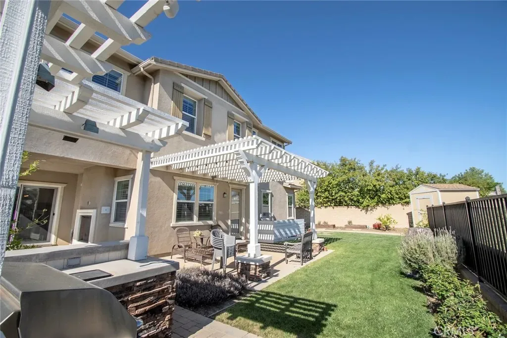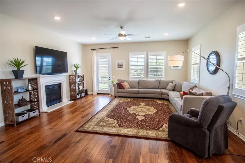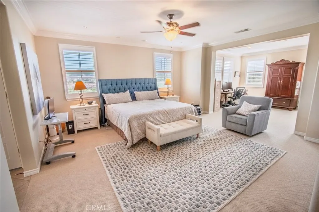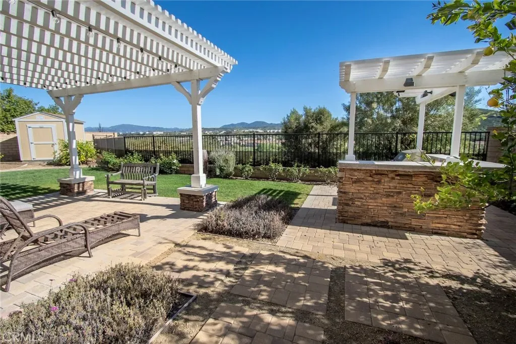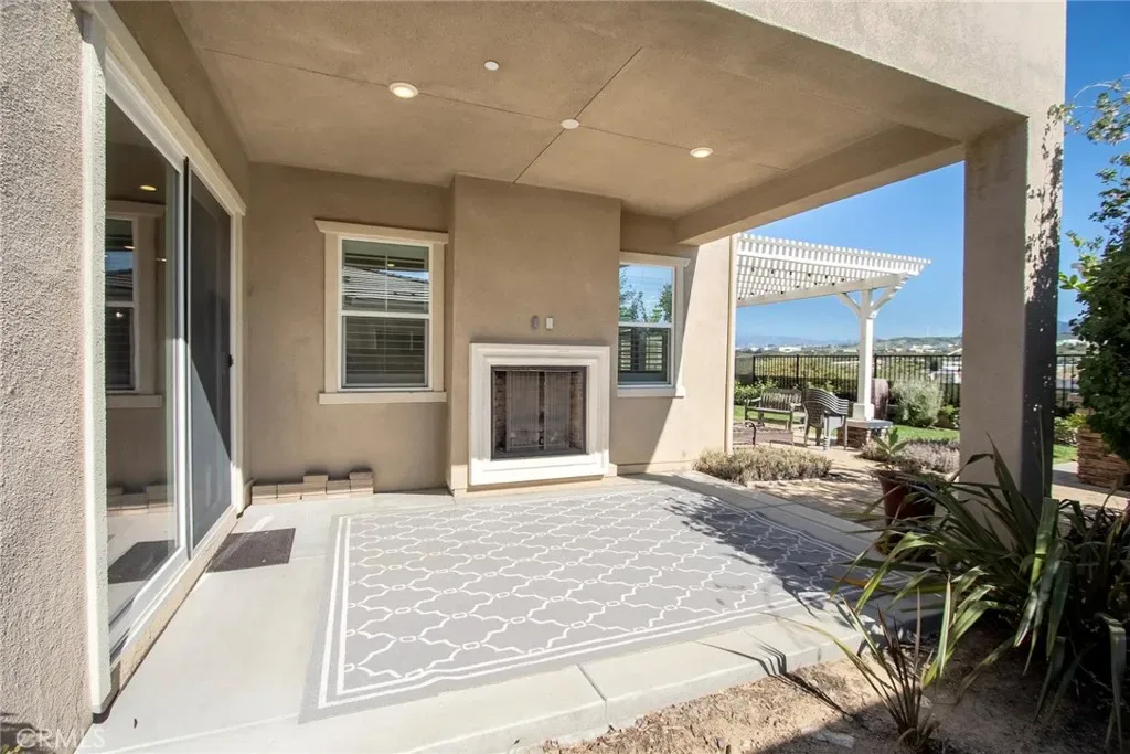 Exceptional executive view home located in the prestigious gated enclave of River Village Classics. Offering 6 potential bedrooms and 4.5 bathrooms, this residence blends refined design with expansive, flexible living. A dramatic entry with rich wood flooring opens to a sophisticated front den adorned with crown molding and plantation shutters. The home unfolds into an elegant open-concept layout where the family and dining spaces connect seamlessly to a chef’s kitchen, anchored by an oversized granite island with generous seating. Appointments include a 5-burner cooktop, double ovens, walk-in pantry, and extensive custom cabinetry. Indoor and outdoor living come together effortlessly as the dining area opens to a covered patio retreat with fireplace, creating an inviting setting for year-round entertaining. The backyard is thoughtfully designed with multiple gathering spaces, including a built-in BBQ with bar seating, grassy area, and an additional covered lounge with fireplace — all positioned to capture sweeping east-facing views and natural afternoon shade. The main level offers a private en-suite bedroom, guest powder room, and a versatile bonus room ideal as a game room, office, or optional sixth bedroom. Upstairs, a spacious loft provides additional living flexibility. The primary suite is a true sanctuary, featuring built-in cabinetry, a wine refrigerator, and an adjoining retreat perfect for a nursery, office, or library. The spa-inspired bath offers dual vanities, a separate makeup area, soaking tub, walk-in shower, and dual walk-in closets. Additional highlights include solar, tankless water heater, dual-zone climate control, and a three-car garage with overhead storage. Residents enjoy access to exclusive HOA amenities including gated entry, clubhouse, pool, spa, BBQ areas, playgrounds, and direct access to the paseo trail system.