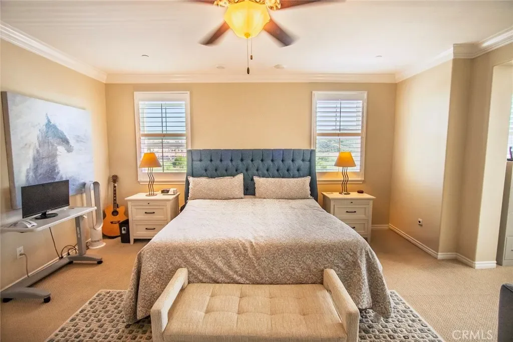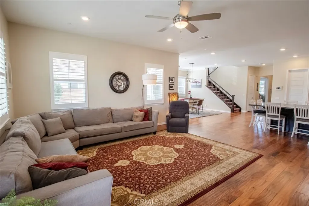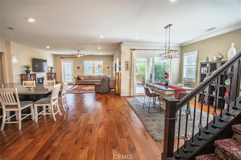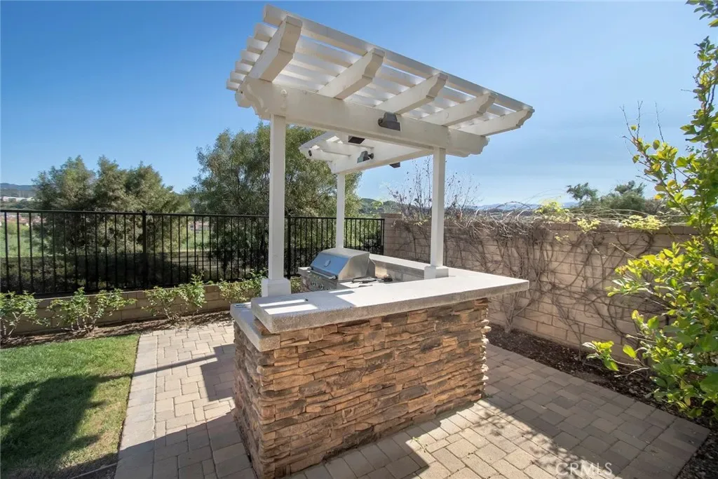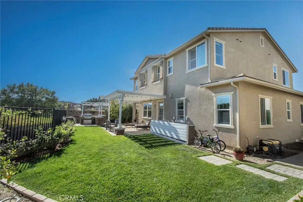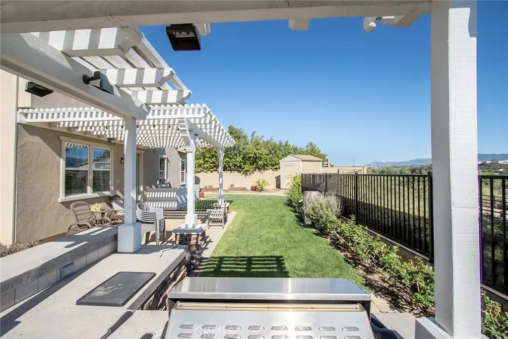 Exceptional executive view home located in the prestigious gated enclave of River Village Classics. Offering 6 potential bedrooms and 4.5 bathrooms, this residence blends refined design with expansive, flexible living. A dramatic entry with rich wood flooring opens to a sophisticated front den adorned with crown molding and plantation shutters. The home unfolds into an elegant open-concept layout where the family and dining spaces connect seamlessly to a chef’s kitchen, anchored by an oversized granite island with generous seating. Appointments include a 5-burner cooktop, double ovens, walk-in pantry, and extensive custom cabinetry. Indoor and outdoor living come together effortlessly as the dining area opens to a covered patio retreat with fireplace, creating an inviting setting for year-round entertaining. The backyard is thoughtfully designed with multiple gathering spaces, including a built-in BBQ with bar seating, grassy area, and an additional covered lounge with fireplace — all positioned to capture sweeping east-facing views and natural afternoon shade. The main level offers a private en-suite bedroom, guest powder room, and a versatile bonus room ideal as a game room, office, or optional sixth bedroom. Upstairs, a spacious loft provides additional living flexibility. The primary suite is a true sanctuary, featuring built-in cabinetry, a wine refrigerator, and an adjoining retreat perfect for a nursery, office, or library. The spa-inspired bath offers dual vanities, a separate makeup area, soaking tub, walk-in shower, and dual walk-in closets. Additional highlights include solar, tankless water heater, dual-zone climate control, and a three-car garage with overhead storage. Residents enjoy access to exclusive HOA amenities including gated entry, clubhouse, pool, spa, BBQ areas, playgrounds, and direct access to the paseo trail system.