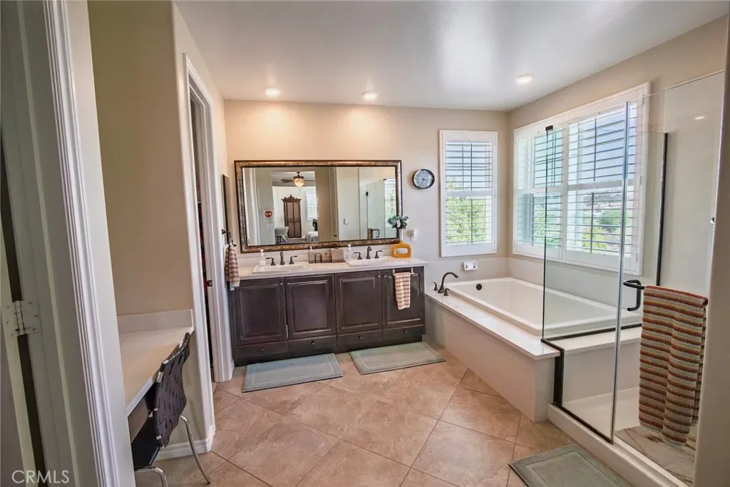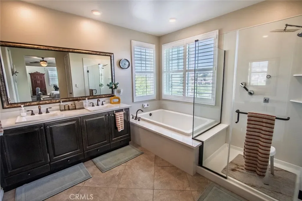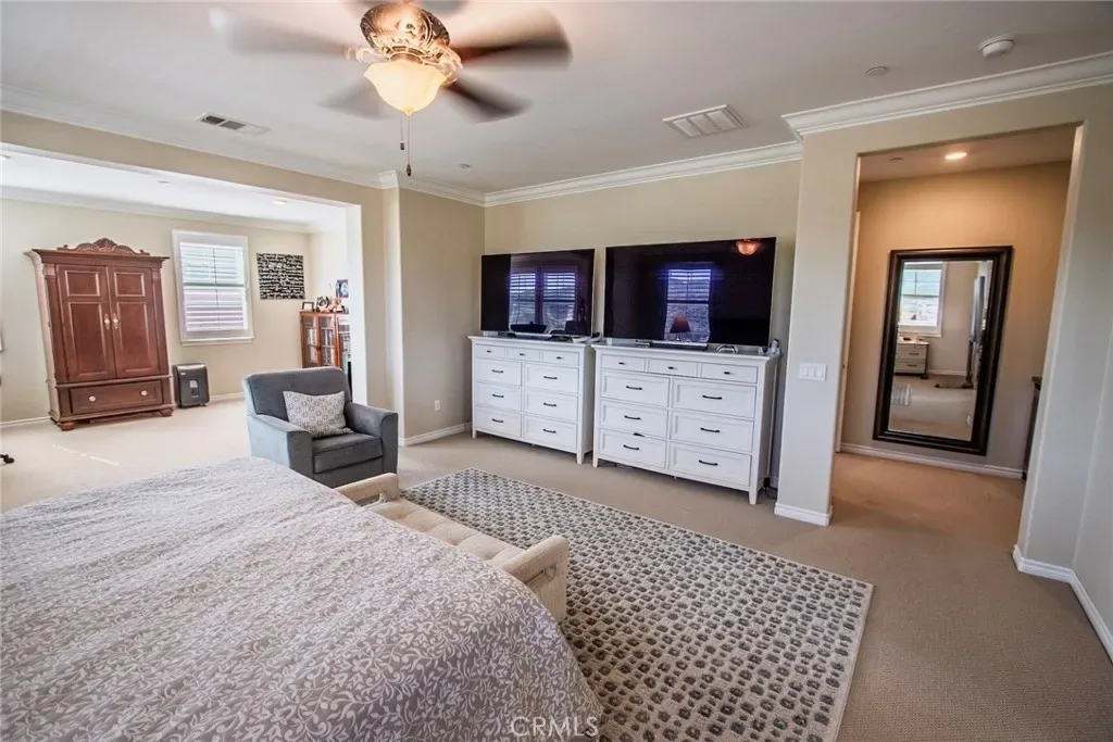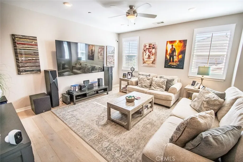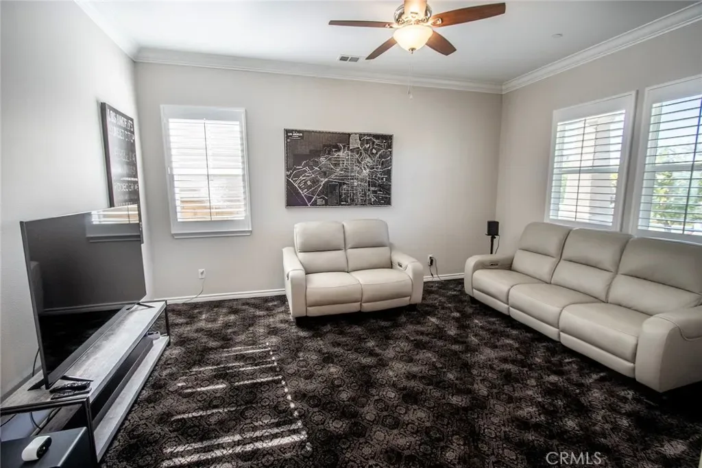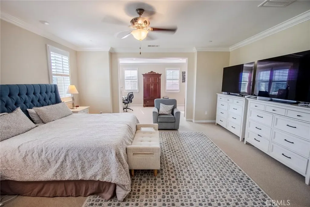 Exceptional executive view home located in the prestigious gated enclave of River Village Classics. Offering 6 potential bedrooms and 4.5 bathrooms, this residence blends refined design with expansive, flexible living. A dramatic entry with rich wood flooring opens to a sophisticated front den adorned with crown molding and plantation shutters. The home unfolds into an elegant open-concept layout where the family and dining spaces connect seamlessly to a chef’s kitchen, anchored by an oversized granite island with generous seating. Appointments include a 5-burner cooktop, double ovens, walk-in pantry, and extensive custom cabinetry. Indoor and outdoor living come together effortlessly as the dining area opens to a covered patio retreat with fireplace, creating an inviting setting for year-round entertaining. The backyard is thoughtfully designed with multiple gathering spaces, including a built-in BBQ with bar seating, grassy area, and an additional covered lounge with fireplace — all positioned to capture sweeping east-facing views and natural afternoon shade. The main level offers a private en-suite bedroom, guest powder room, and a versatile bonus room ideal as a game room, office, or optional sixth bedroom. Upstairs, a spacious loft provides additional living flexibility. The primary suite is a true sanctuary, featuring built-in cabinetry, a wine refrigerator, and an adjoining retreat perfect for a nursery, office, or library. The spa-inspired bath offers dual vanities, a separate makeup area, soaking tub, walk-in shower, and dual walk-in closets. Additional highlights include solar, tankless water heater, dual-zone climate control, and a three-car garage with overhead storage. Residents enjoy access to exclusive HOA amenities including gated entry, clubhouse, pool, spa, BBQ areas, playgrounds, and direct access to the paseo trail system.