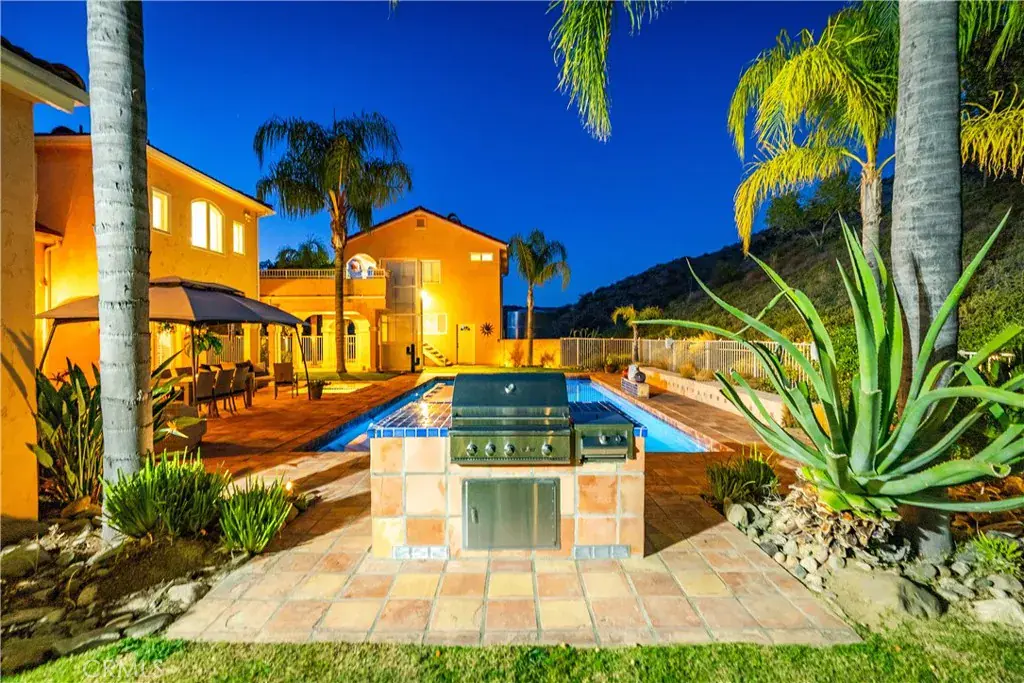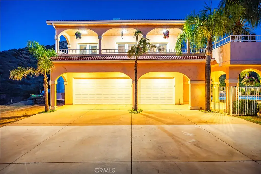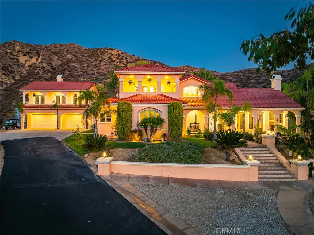 Discover unmatched tranquility and sweeping mountain vistas from this custom Mediterranean estate, perfectly set on six plush acres in historic San Francisquito Canyon. Built in 1994, this 3,151 sq. ft. villa offers 3 bedrooms, 2.5 baths, and a versatile bonus room. A grand double-door entry welcomes you past lighted fountains into a foyer with vaulted ceilings and authentic Saltillo tile floors throughout the main level. The living and dining rooms center around a Spanish-tiled wood burning fireplace, framed by windows and French doors that open to the front patio and breathtaking views. The chef’s kitchen features cobalt blue Italian tile, a butcher block island, and a walk-in pantry, while the adjoining family room offers a wood stove and views of the pool. The main level also includes two bedrooms, 1.5 baths, a bonus room, and a laundry area. Upstairs, the primary suite is a private retreat with vaulted ceilings, panoramic views, a private deck, and a spa-inspired bath with Jacuzzi tub, large shower, and dual vanities. Step outside to an entertainer’s paradise featuring a 20′ x 40′ heated pool and spa, built-in BBQ, and expansive patios perfect for relaxing or entertaining. The lower acreage offers open meadows ideal for horses, barns, storage, or stables. Above the oversized 3-car garage -with 9’+ ceilings, 220V power, sink, and automatic openers – is a fully permitted 650+ sq. ft. guest house featuring vaulted ceilings, a kitchen, wood stove, large bedroom, 3/4 bath, and private deck with panoramic views. An elevator provides wheelchair access, perfect for guests or extended family. Enjoy ultimate privacy where deer graze at dusk and peace surrounds you. A true blend of Mediterranean charm and Santa Clarita serenity – this one-of-a-kind estate must be seen to be believed.
