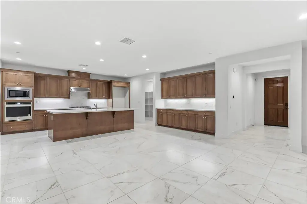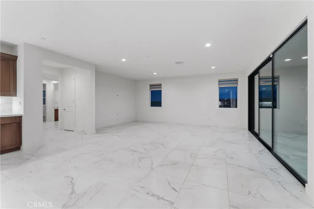 Designed for both comfort and entertaining, the heart of the home is the chef’s kitchen with quartz countertops, oversized center island, stainless steel appliances, custom cabinetry, and recessed lighting throughout. The adjacent dining area includes a built-in buffet, adding both style and functionality. The expansive great room showcases tile flooring and dramatic triple sliding glass doors, creating seamless indoor-outdoor living.