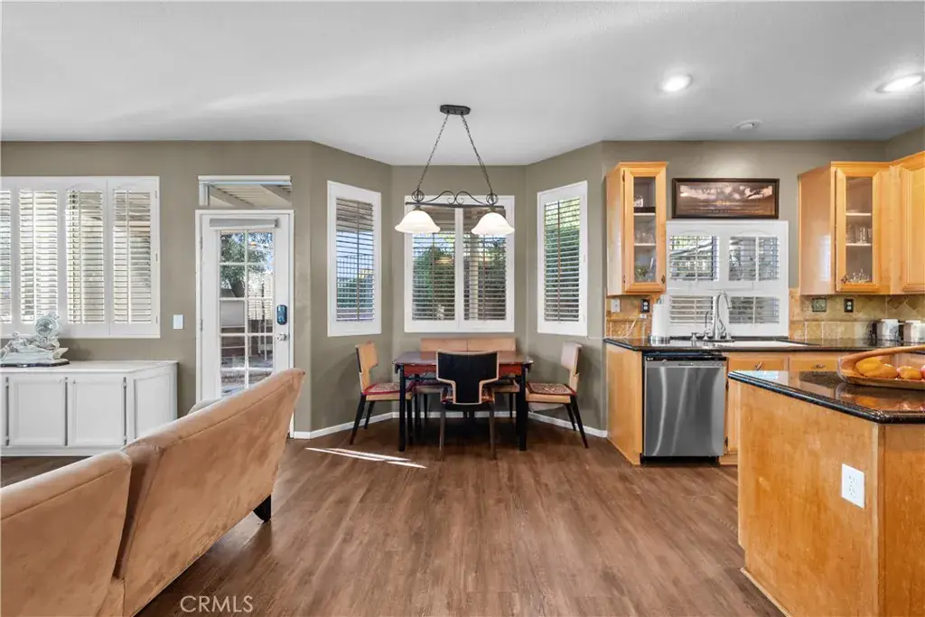 The spacious living room showcases vaulted ceilings and abundant windows that fill the home with natural light and scenic views. The open kitchen is thoughtfully designed with a stainless-steel dishwasher, double oven, built-in microwave, ample counter space, pantry, and a center island that connects seamlessly to the breakfast area and opens to the family room—perfect for entertaining and everyday living.