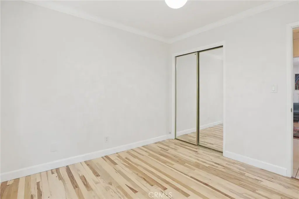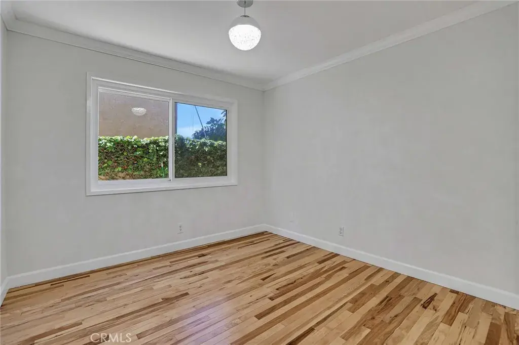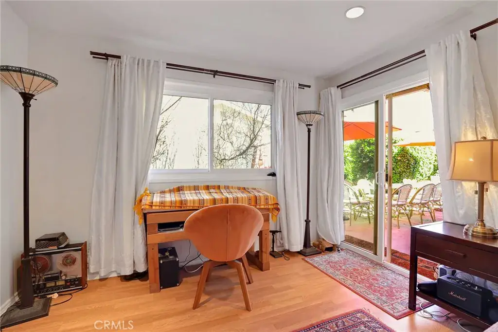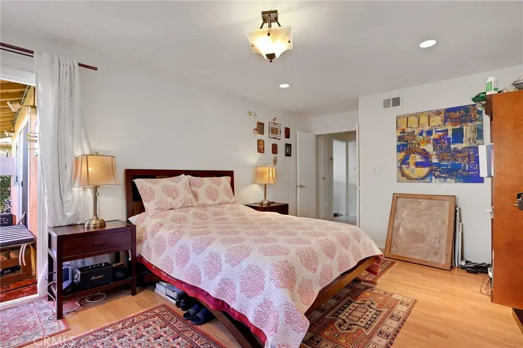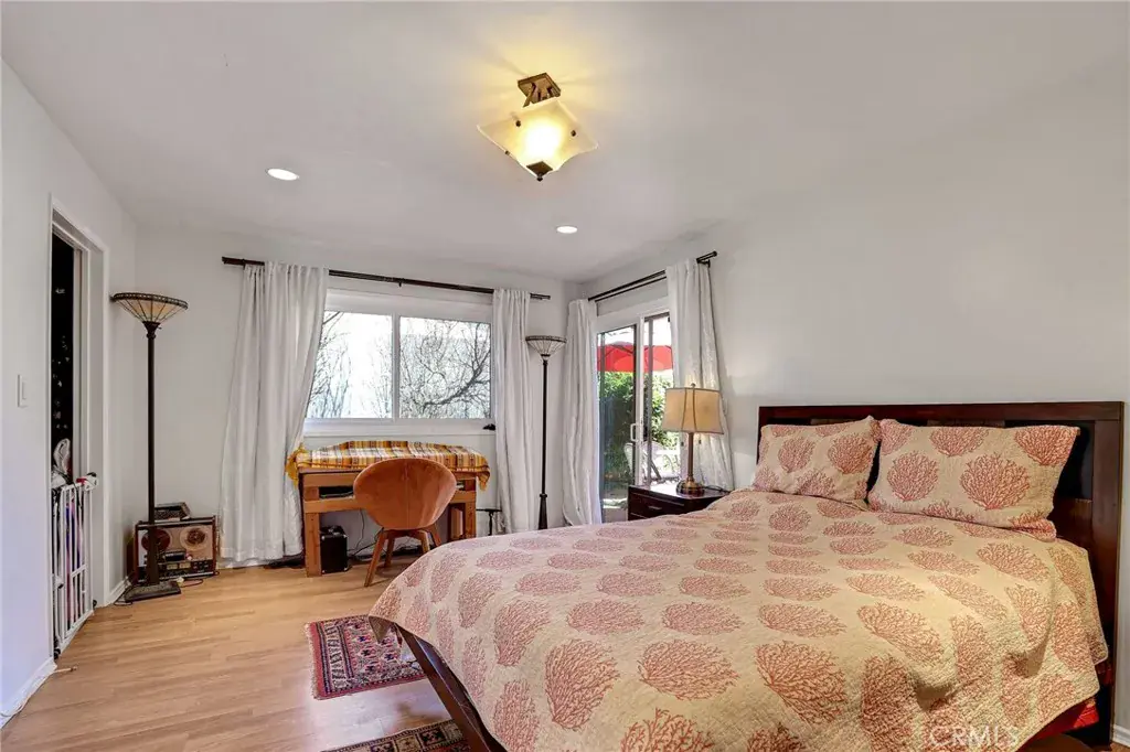 Master bedroom, with beautiful wood flooring and a remodeled ensuite bathroom. This spectacular Master bathroom comes complete with a dual-sink vanity, high-end Italian hardware, smart mirror, and a luxurious tiled shower topped with a high-end rain shower head. The master also boasts a generous walk-in closet and a private sliding glass door that opens to the backyard, a perfect spot for relaxation.