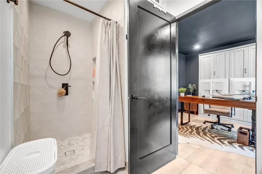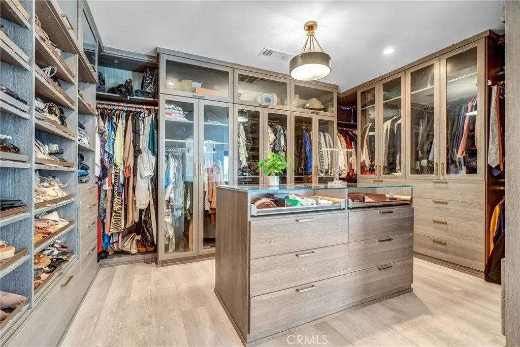 The spacious primary suite includes a custom walk-in closet by California Closets and a flexible layout that can be adapted into a fifth bedroom, nursery, or home office. Throughout the home, each room is hardwired for high-speed internet and supported by a full security system with cameras.