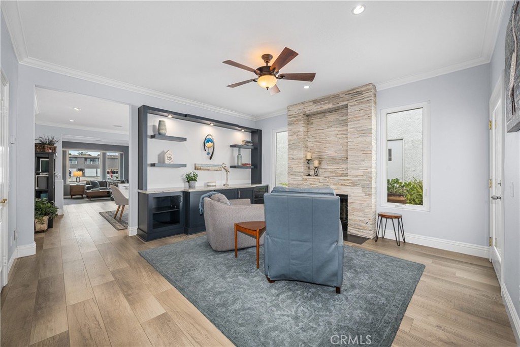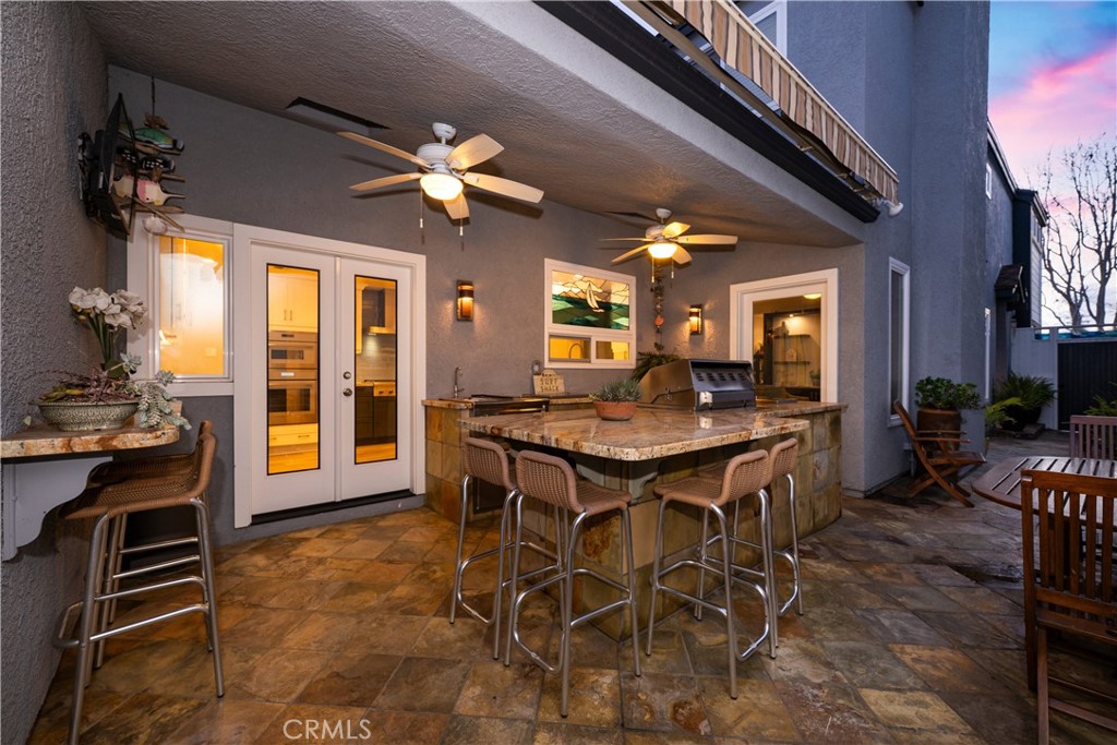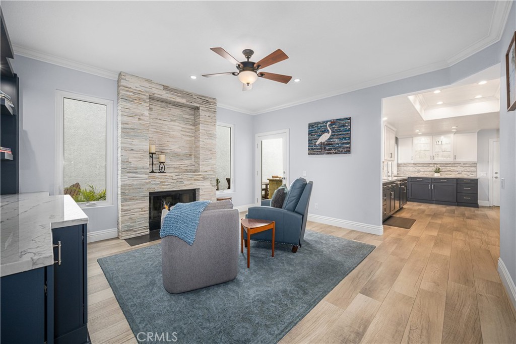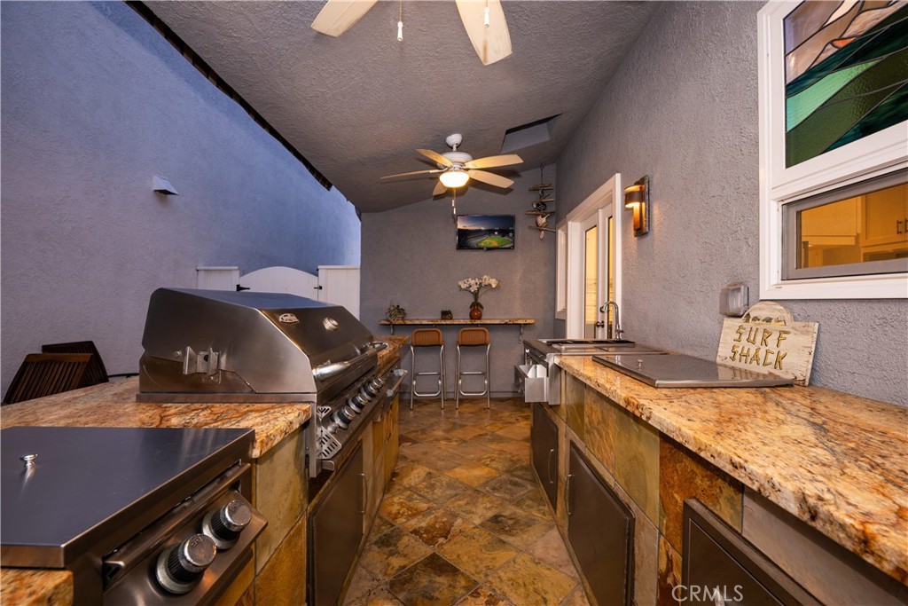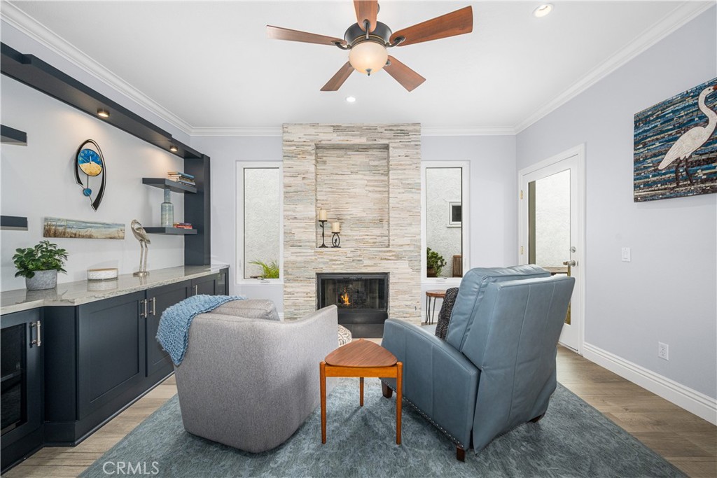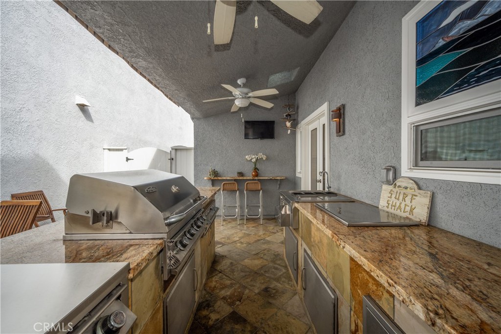 Just steps from the sand in the heart of Old Town Seal Beach, this exceptional coastal residence captures the essence of luxury beach living—where ocean breezes, walkable Main Street charm, and refined design come together in one remarkable home. Spanning approximately 2,848 square feet on a 3,080 square foot lot, this four-bedroom, three-and-a-half-bath residence has been thoughtfully upgraded to deliver both elegance and comfort, creating the perfect setting for relaxed coastal living and effortless entertaining. Inside, custom coastal influences—including stained glass accents, rich finishes, and two fireplaces—create warmth and character throughout. The remodeled gourmet kitchen serves as the centerpiece, featuring custom shaker cabinetry, a built-in refrigerator, premium Thermador appliances including a six-burner range and oven, wine cooler, and a striking stacked stone backsplash. The kitchen flows seamlessly into expansive living and dining areas designed for both everyday living and hosting. Adjacent spaces include a welcoming den with a floor-to-ceiling stacked stone fireplace and custom built-ins, while the main living room offers a second fireplace and motorized blackout blinds. New flooring, carpet, and dual-pane windows enhance both style and efficiency. The roofline has been extended to create a covered outdoor patio with a retractable awning, enhancing indoor-outdoor living. The backyard is an entertainer’s dream, featuring a fully equipped outdoor kitchen and BBQ area with cooktop, refrigerator, wet bar, granite counters, and elegant teak furnishings—perfect for enjoying warm coastal evenings. Recent upgrades include fresh exterior paint, a new roof, and a new balcony. Upstairs, the primary suite offers custom built-ins, walk-in closets, and ocean views. The third-floor viewing deck provides a stunning setting for sunset gatherings, complete with a fire pit and dining area—ideal for relaxing or entertaining under the stars. A secondary bedroom includes an ensuite bath, and upstairs laundry adds convenience. Ceiling fans throughout capture ocean breezes, with central air conditioning available when needed. Located just moments from Seal Beach’s iconic pier, boutique shopping, and local cafés, this home offers a rare opportunity to experience the relaxed coastal lifestyle of Old Town. Selected furnishings may be offered separately.