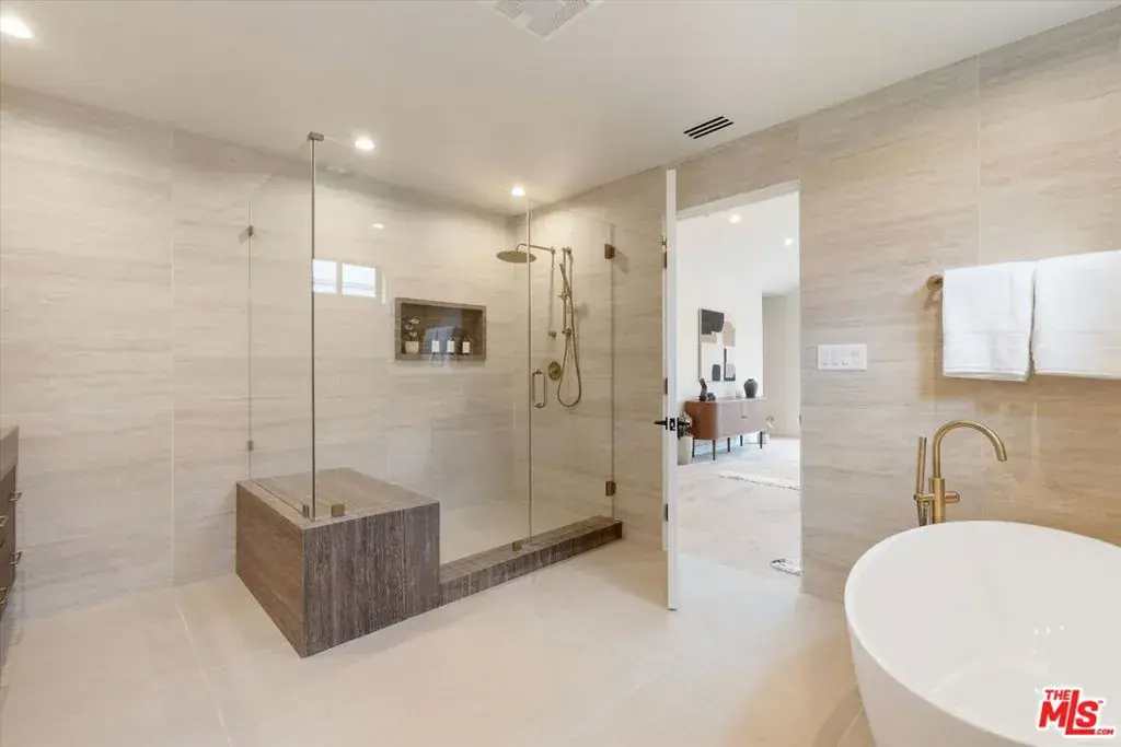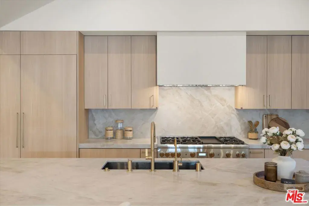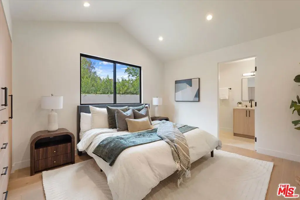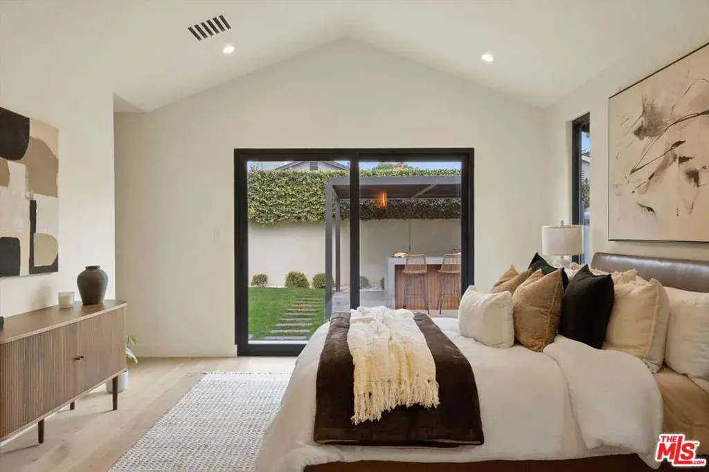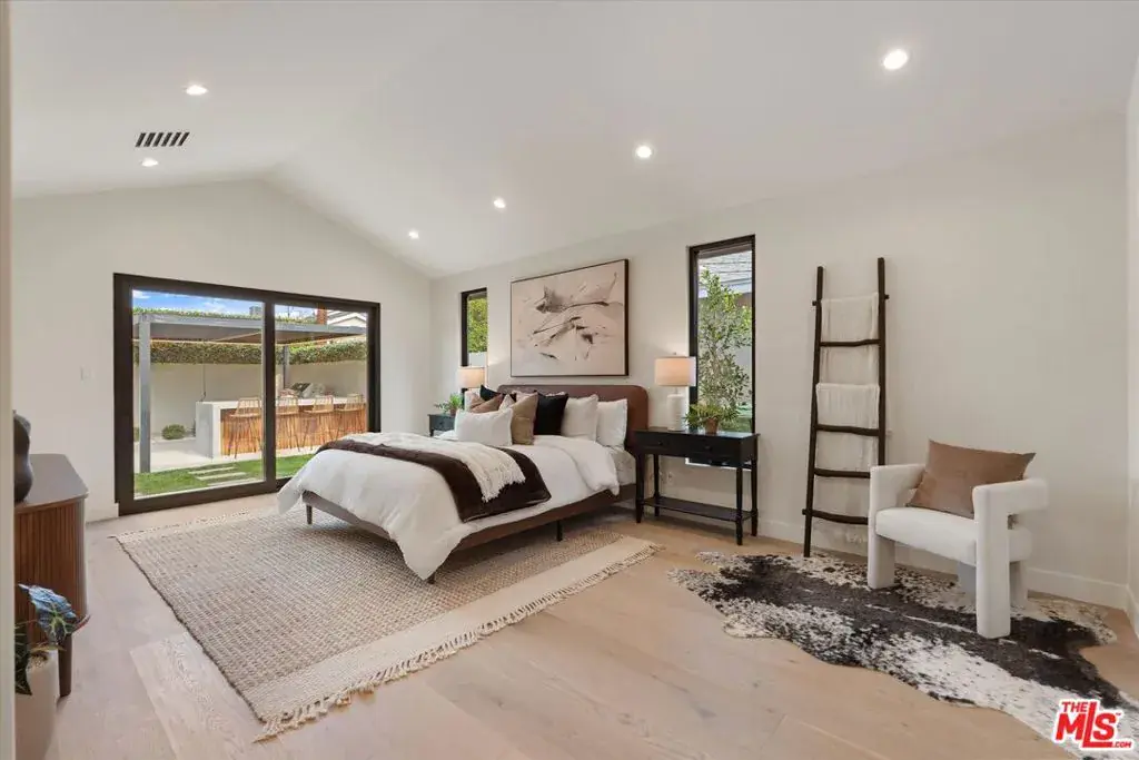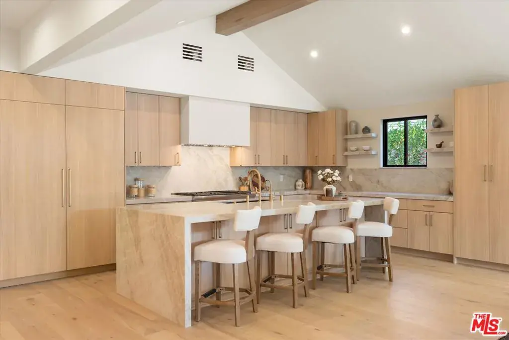 Fully remodeled, single-story Mediterranean Modern tucked in one of Sherman Oaks’ most sought-after pockets of Chandler Estates! This 3 bedroom, 3.5 bathroom, single story home was taken down to the studs and completely reimagined with today’s luxury buyer in mind. A number of major upgraded have been added to include new electrical, plumbing, drywall, HVAC, roofing, doors, windows and top of the line designer finishes throughout. The exterior showcases authentic Jerusalem stone, while inside features soaring vaulted ceilings, Burton Way hardwood floors, and oversized windows flood the open floor plan with natural light, creating an airy, open aesthetic. The chef’s kitchen features Taj Mahal quartzite countertops, custom whitewashed Santa Barbara rift oak cabinetry with dark walnut accents in the primary suite, all crafted with Blum soft-close mechanisms, European hinges, and undercount tandem slides, with premium Thermador appliances. Each sizable bedroom includes its own ensuite bathroom, finished with travertine stone, Venetian plaster walls, and a standout green travertine powder room. Additional upgrades include side by side LG washer/dryer, Sonos surround system, Starlink WiFi built into the home, Amazon smart tablet control panel, Ring doorbell, EV charging capabilities and built-in cameras for modern convenience and peace of mind. The entertainer’s backyard is your private oasis complete with an outdoor kitchen, wine fridge, built-in BBQ, and covered lounge surrounded by lush, low-maintenance landscaping. Turnkey, timeless, and truly one of a kind.