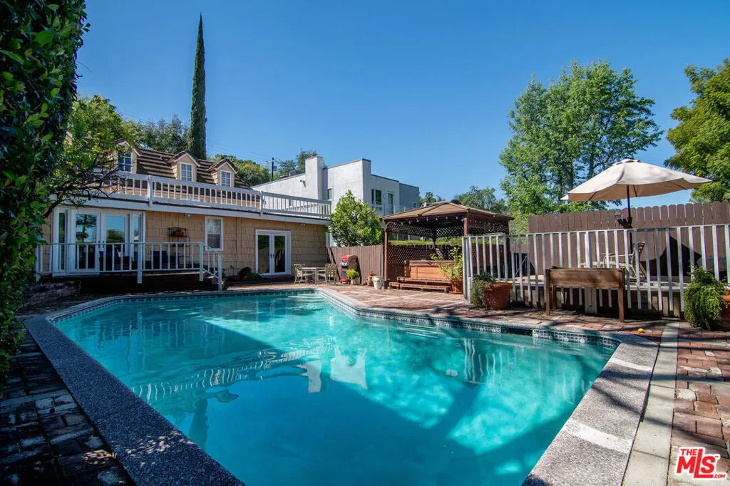 Privately set on a street-to-street lot with cul de sac entrance on Dunbar Place in one of Sherman Oaks’ most coveted South of the Blvd neighborhoods, this inviting residence blends a prime location with timeless architectural character. Through the striking front gate and lush, welcoming yard, you’re greeted by a spectacular great room featuring vaulted ceilings, a beautiful bay window, and a fireplace–an ideal setting to relax with a good book as dappled sunlight fills the space. Nearly 2,000sft, and 3bd/3ba, the thoughtfully designed split-level floorplan offers a newly remodeled kitchen, formal dining room, two generously sized bedrooms, and a full bath on the main level. Downstairs, the serene and private primary suite with ensuite bath enjoys treetop views and glimpses of distant mountains, creating a true retreat. The lower level also features a cozy entertainer’s family room perfect for movie nights, game days, or casual gatherings. Double glass doors open to a sprawling deck where you can enjoy morning coffee or evening wine overlooking the pool and spa, ideal for both relaxing and entertaining. A rare and highly desirable second entrance at the rear of the property opens onto a quiet cul-de-sac, offering convenient access to the garage and additional parking. Adjacent to Beverly Glen, this home provides easy access to Beverly Hills, the Westside, and Ventura Boulevard’s premier shopping and dining. Tranquil and private, yet moments from the city this is Sherman Oaks living at its best.