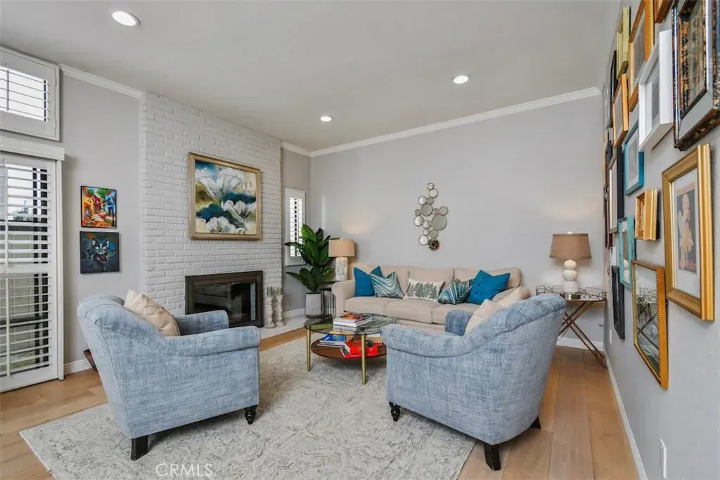 The open-concept living space features a decorative fireplace and flows effortlessly into the dining area featuring custom built-in cabinetry, creating a refined yet inviting setting. Sliding glass doors open to a private, sun-lit patio, ideal for morning coffee or evening relaxation. The spacious, open-style kitchen is tastefully appointed with stainless steel appliances, granite countertops, and generous cabinetry, perfect for both elevated entertaining and everyday living. A powder room and a dedicated laundry area with space for a full-sized side-by-side washer and dryer complete the main level.