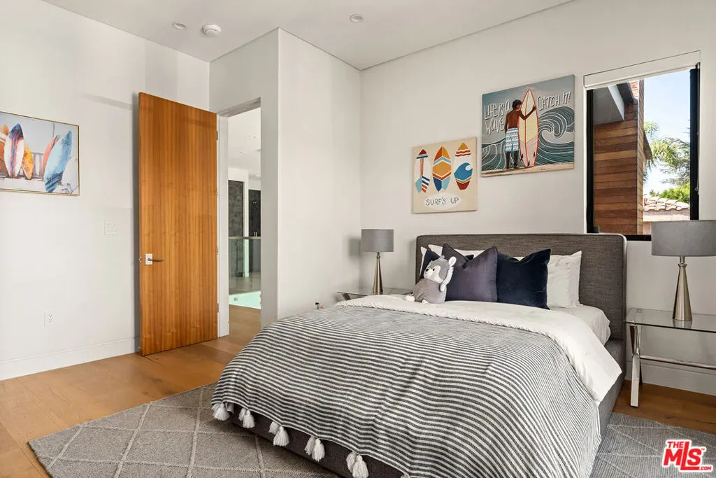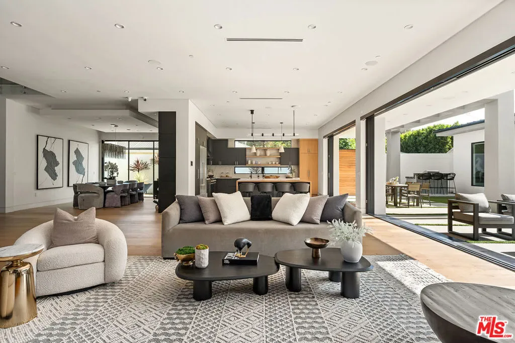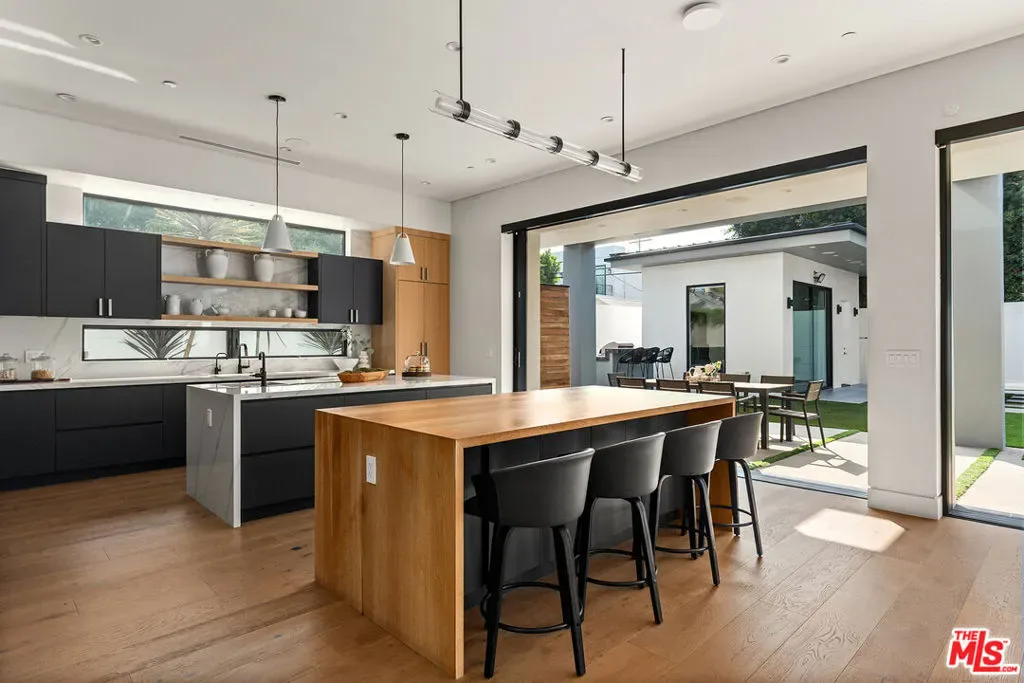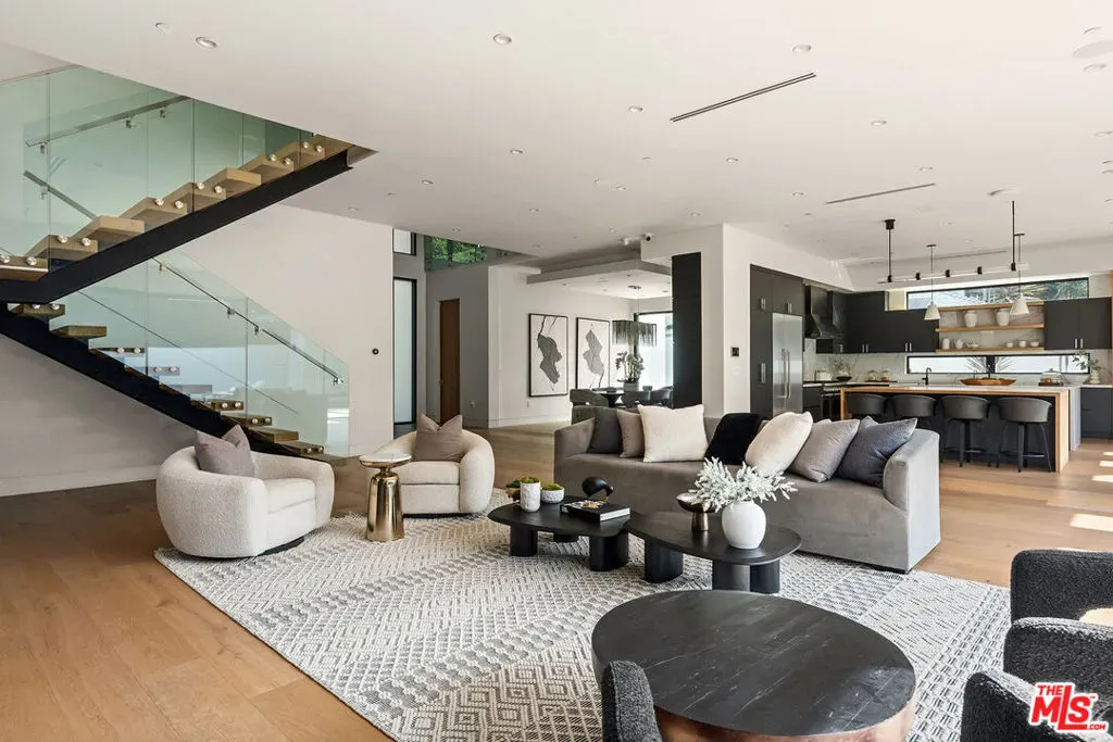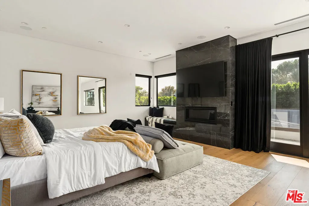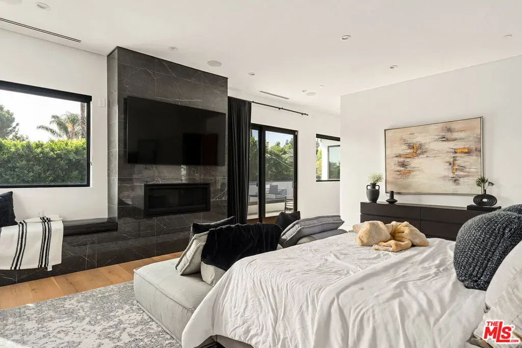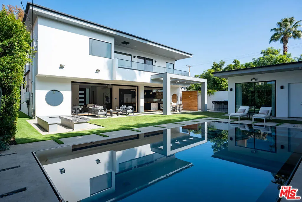 A stunning modern residence set on an expansive, flat lot. This 5-bedroom, 6-bath oasis was thoughtfully designed to combine open-concept living with generous space for both entertaining and privacy. Enter through the 10-foot entry door into an open layout featuring wide-plank European oak floors, high ceilings throughout, and a custom floating glass staircase. The main living area flows seamlessly between the formal dining room with built-in buffet, the living room centered around a floor-to-ceiling marble fireplace, and a contemporary kitchen showcasing custom cabinetry, quartz countertops, high-end appliances, and dual islands designed for gourmet cooking and entertaining. The primary suite serves as a private retreat, featuring a marble fireplace, balcony overlooking the yard, spacious walk-in closet, and a spa-inspired bathroom. Full-length glass pocket doors open to a resort-style backyard with a zero-edge pool, spa, fire pit, built-in grill, and a pool house with its own bath offering the potential for conversion to an ADU, private recording studio, office, or creative workspace. A guest bedroom is conveniently located on the main level, while upstairs features additional bedrooms including a guest suite, a lofted landing with custom built-ins, and a spacious gym that can also serve as an additional bedroom. The upper level also includes a home theater with its own bath, providing flexibility to be used as another bedroom or entertainment space. A well-appointed laundry room adds everyday convenience. Upgrades include electric blinds, a smart home system, custom lighting, security cameras, and more. This exceptional home seamlessly blends luxury, functionality, and style, offering an unparalleled living experience.
