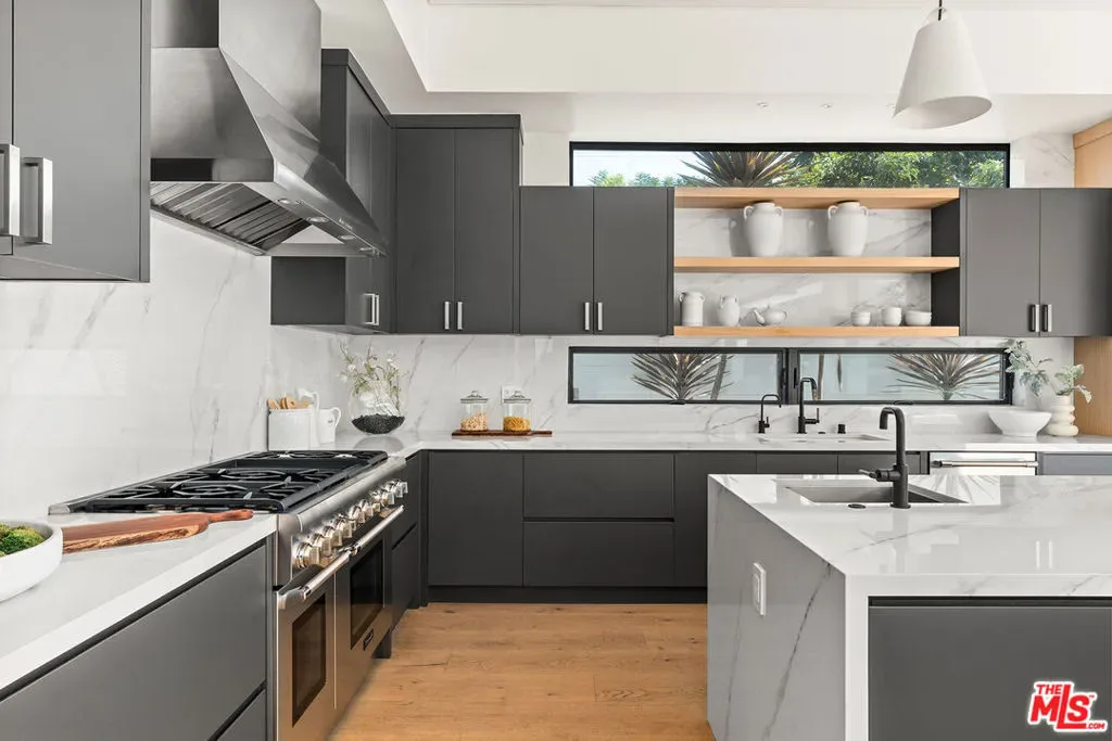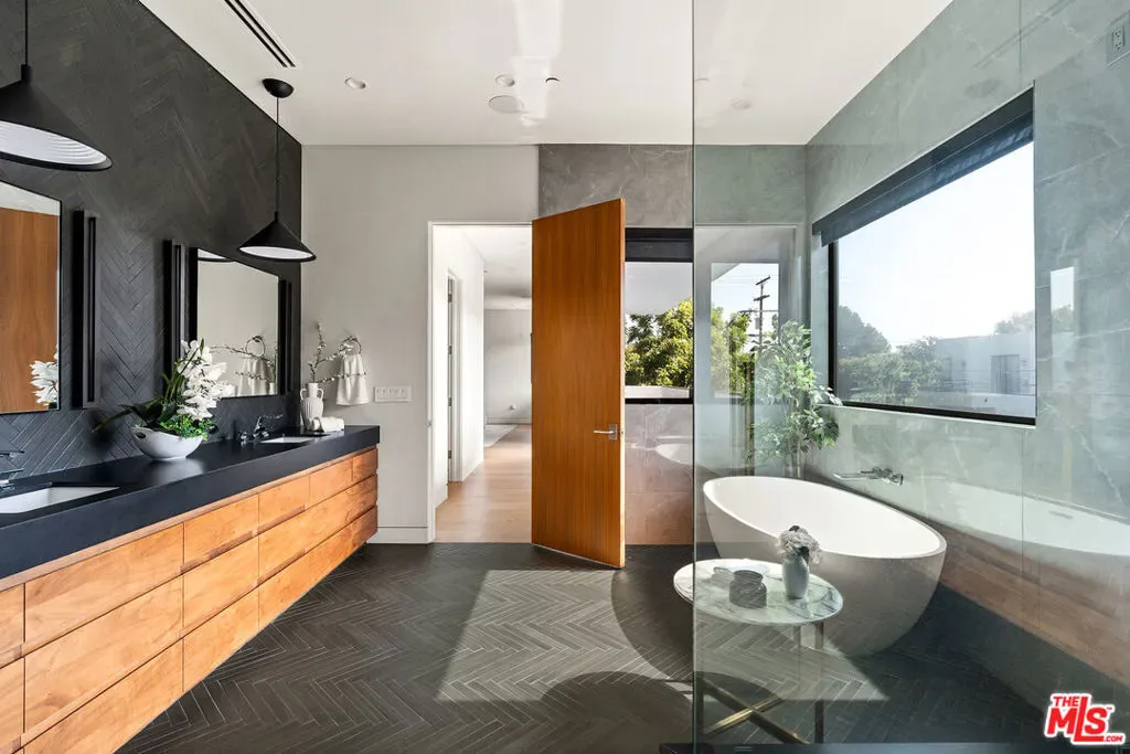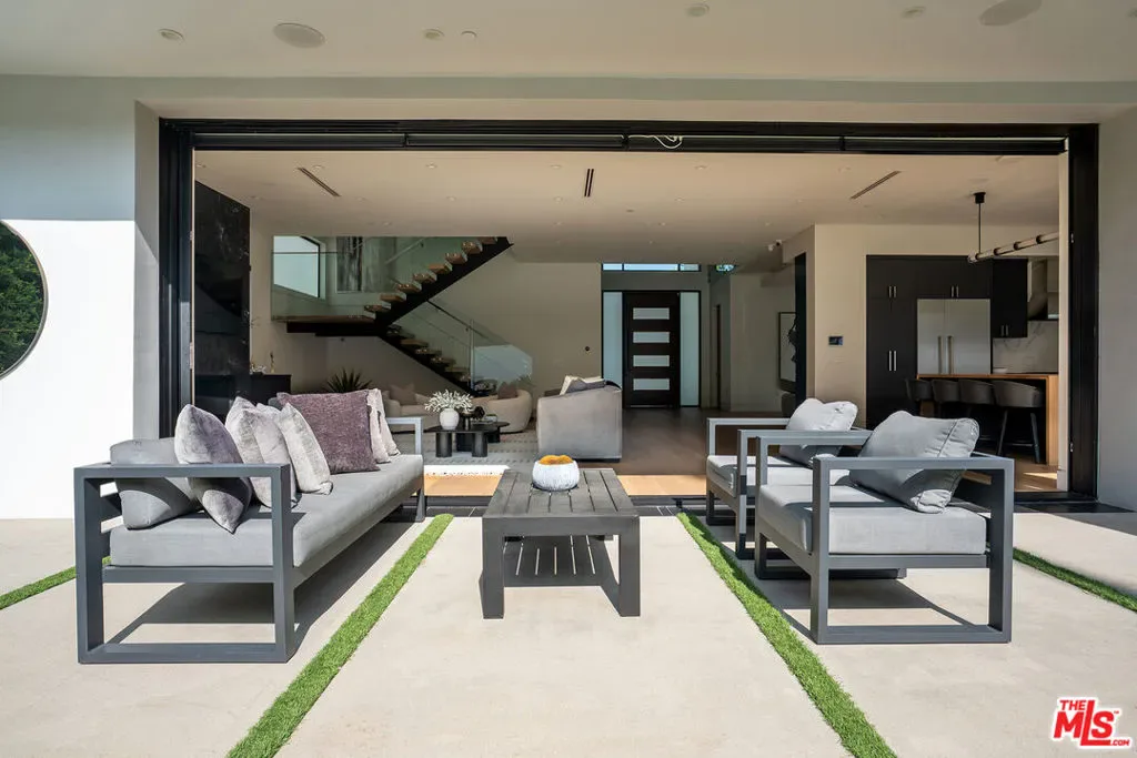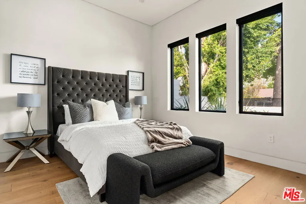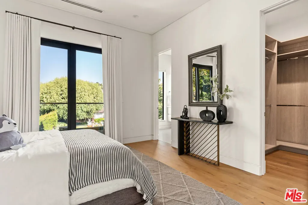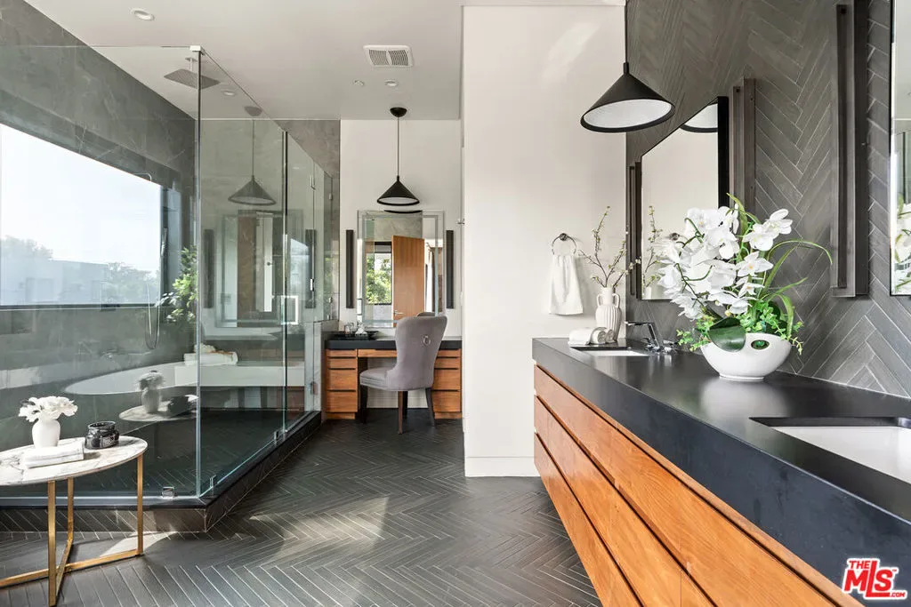 A stunning modern residence set on an expansive, flat lot. This 5-bedroom, 6-bath oasis was thoughtfully designed to combine open-concept living with generous space for both entertaining and privacy. Enter through the 10-foot entry door into an open layout featuring wide-plank European oak floors, high ceilings throughout, and a custom floating glass staircase. The main living area flows seamlessly between the formal dining room with built-in buffet, the living room centered around a floor-to-ceiling marble fireplace, and a contemporary kitchen showcasing custom cabinetry, quartz countertops, high-end appliances, and dual islands designed for gourmet cooking and entertaining. The primary suite serves as a private retreat, featuring a marble fireplace, balcony overlooking the yard, spacious walk-in closet, and a spa-inspired bathroom. Full-length glass pocket doors open to a resort-style backyard with a zero-edge pool, spa, fire pit, built-in grill, and a pool house with its own bath offering the potential for conversion to an ADU, private recording studio, office, or creative workspace. A guest bedroom is conveniently located on the main level, while upstairs features additional bedrooms including a guest suite, a lofted landing with custom built-ins, and a spacious gym that can also serve as an additional bedroom. The upper level also includes a home theater with its own bath, providing flexibility to be used as another bedroom or entertainment space. A well-appointed laundry room adds everyday convenience. Upgrades include electric blinds, a smart home system, custom lighting, security cameras, and more. This exceptional home seamlessly blends luxury, functionality, and style, offering an unparalleled living experience.