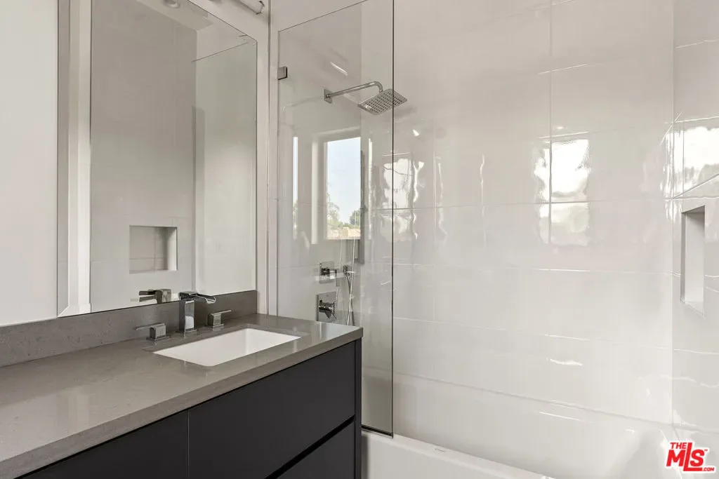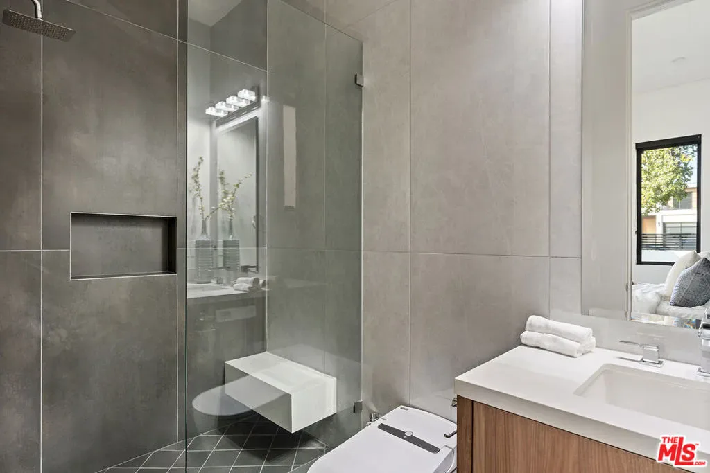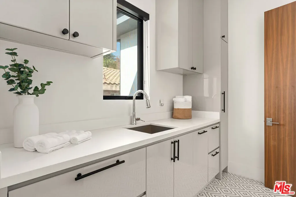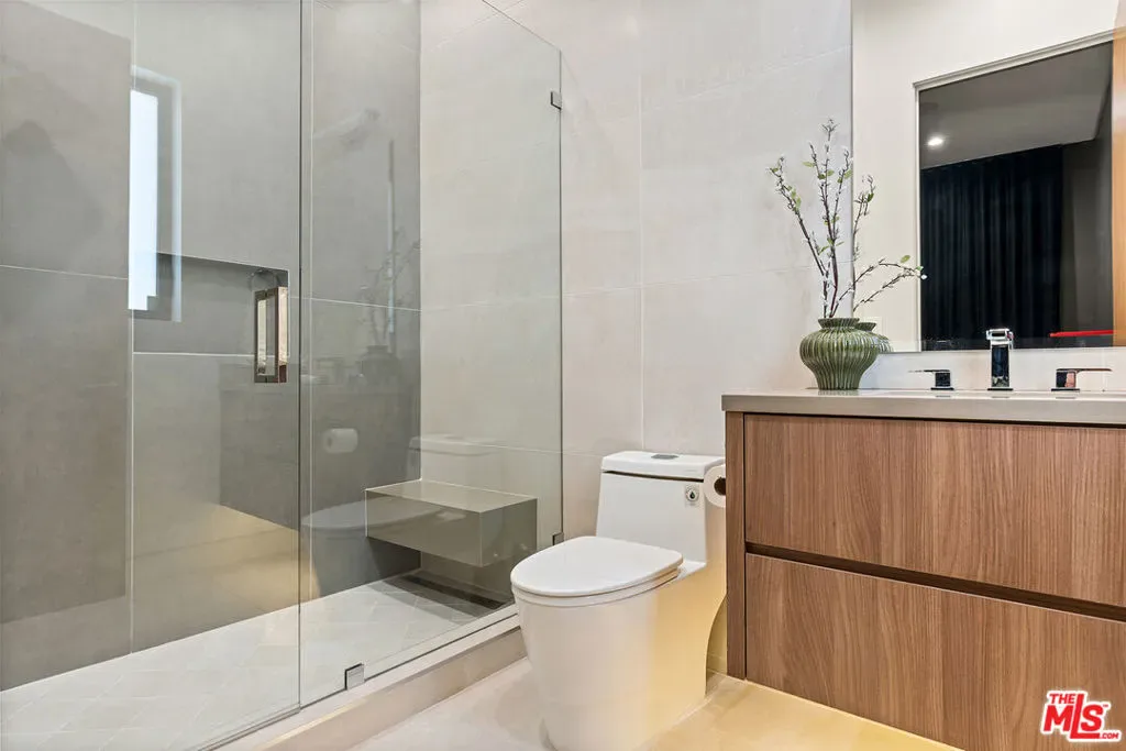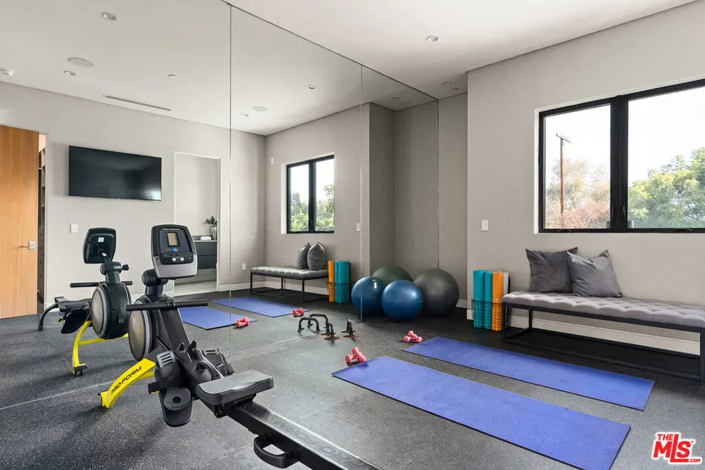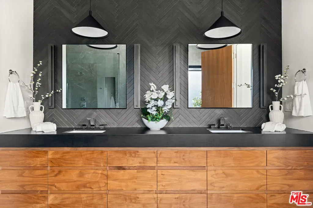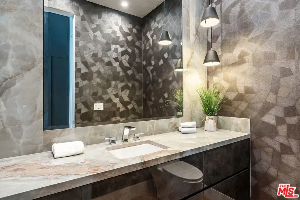 A stunning modern residence set on an expansive, flat lot. This 5-bedroom, 6-bath oasis was thoughtfully designed to combine open-concept living with generous space for both entertaining and privacy. Enter through the 10-foot entry door into an open layout featuring wide-plank European oak floors, high ceilings throughout, and a custom floating glass staircase. The main living area flows seamlessly between the formal dining room with built-in buffet, the living room centered around a floor-to-ceiling marble fireplace, and a contemporary kitchen showcasing custom cabinetry, quartz countertops, high-end appliances, and dual islands designed for gourmet cooking and entertaining. The primary suite serves as a private retreat, featuring a marble fireplace, balcony overlooking the yard, spacious walk-in closet, and a spa-inspired bathroom. Full-length glass pocket doors open to a resort-style backyard with a zero-edge pool, spa, fire pit, built-in grill, and a pool house with its own bath offering the potential for conversion to an ADU, private recording studio, office, or creative workspace. A guest bedroom is conveniently located on the main level, while upstairs features additional bedrooms including a guest suite, a lofted landing with custom built-ins, and a spacious gym that can also serve as an additional bedroom. The upper level also includes a home theater with its own bath, providing flexibility to be used as another bedroom or entertainment space. A well-appointed laundry room adds everyday convenience. Upgrades include electric blinds, a smart home system, custom lighting, security cameras, and more. This exceptional home seamlessly blends luxury, functionality, and style, offering an unparalleled living experience.