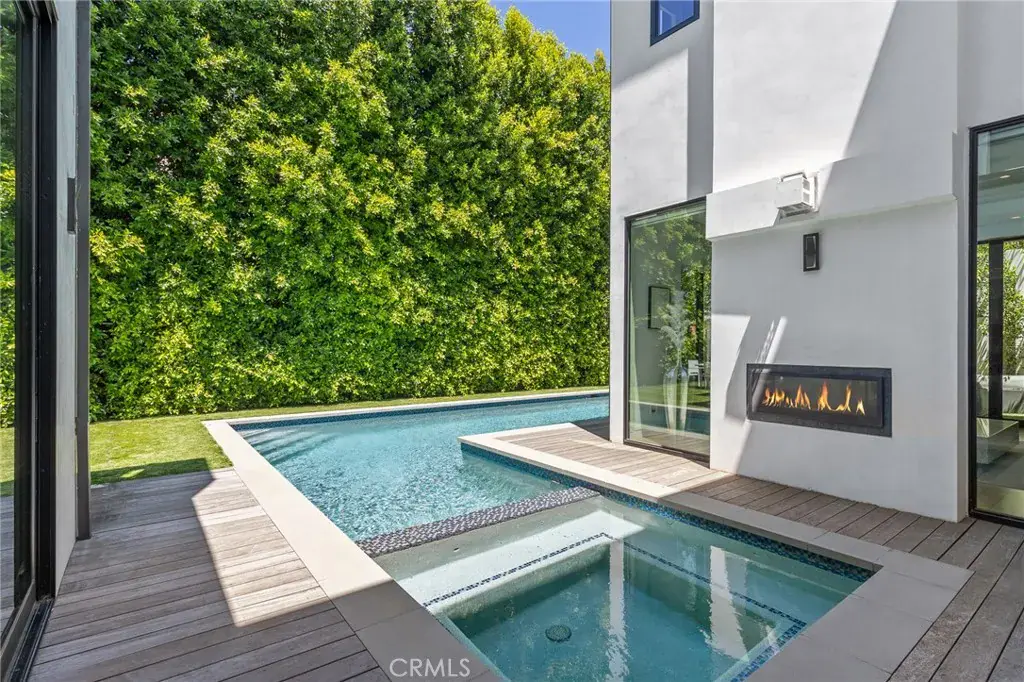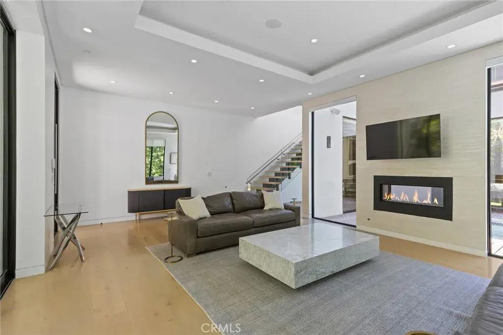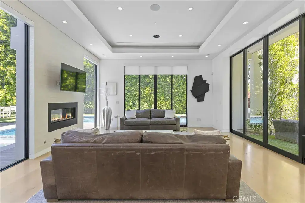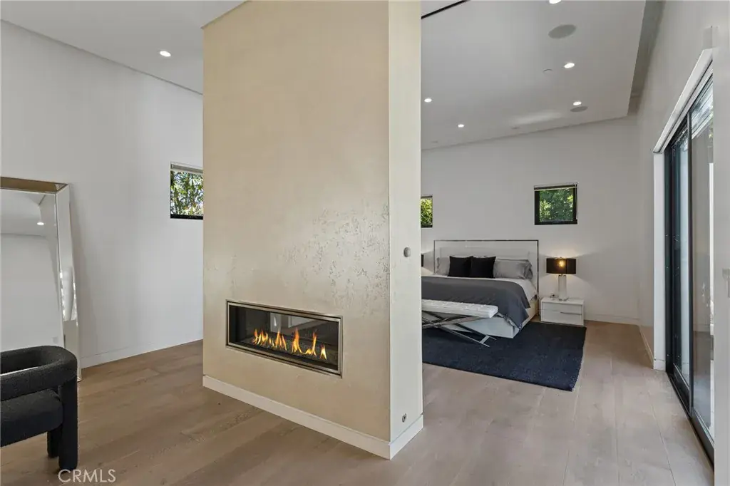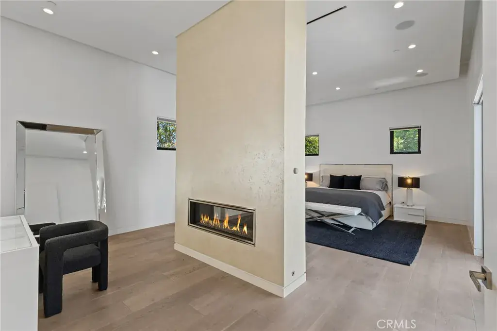 Soaring ceilings and walls of glass fill the interiors with natural light, seamlessly connecting the open-concept living, dining, and chef’s kitchen. The kitchen features premium Bosch and Viking appliances, custom cabinetry, a walk-in pantry, and a striking Calacatta marble island, complemented by a sleek glass-enclosed wine display and double-sided fireplace.