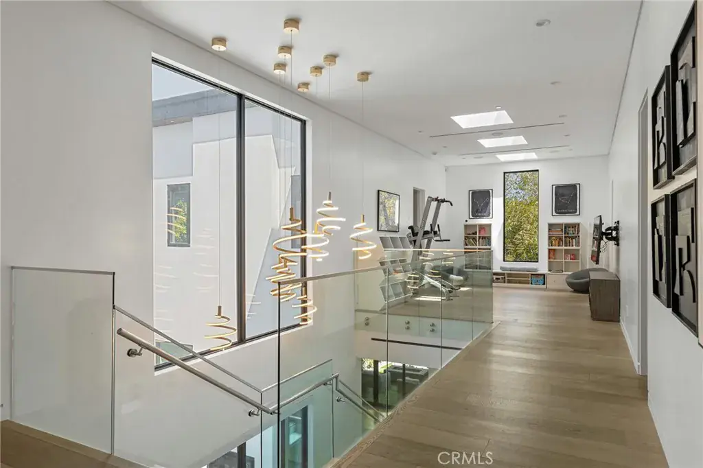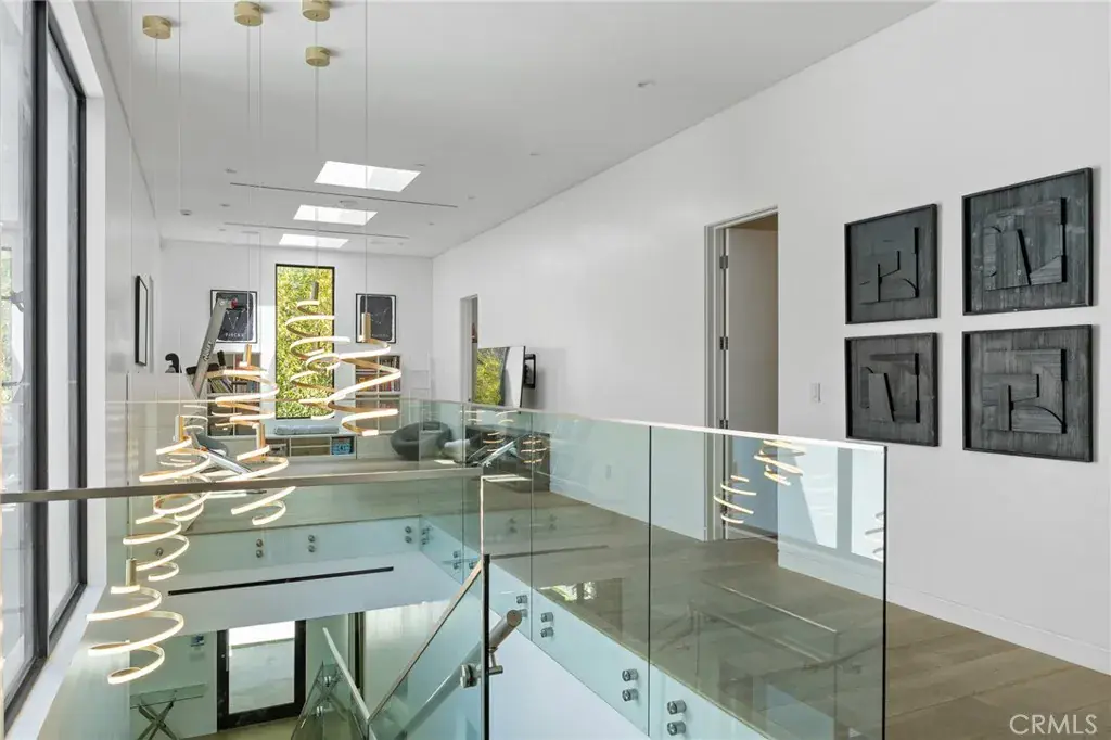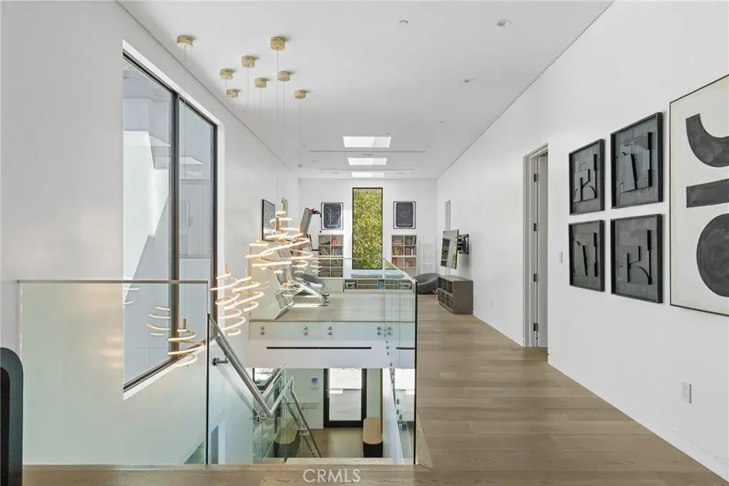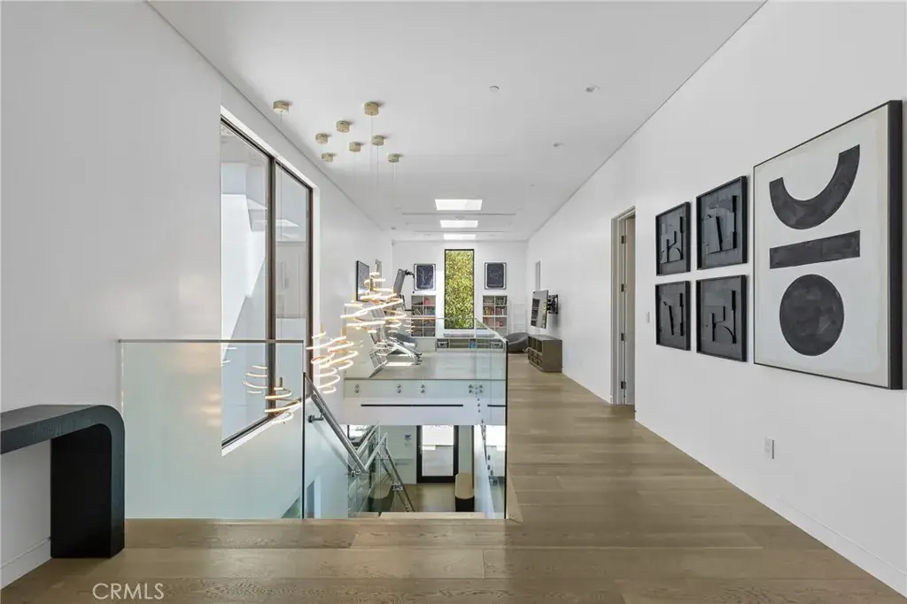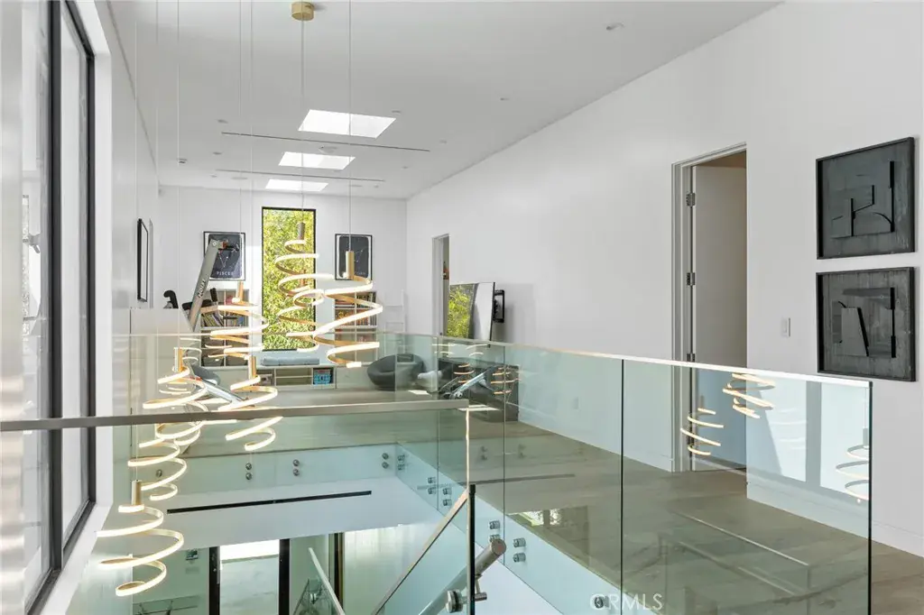 Soaring ceilings and walls of glass fill the interiors with natural light, seamlessly connecting the open-concept living, dining, and chef’s kitchen. The kitchen features premium Bosch and Viking appliances, custom cabinetry, a walk-in pantry, and a striking Calacatta marble island, complemented by a sleek glass-enclosed wine display and double-sided fireplace.