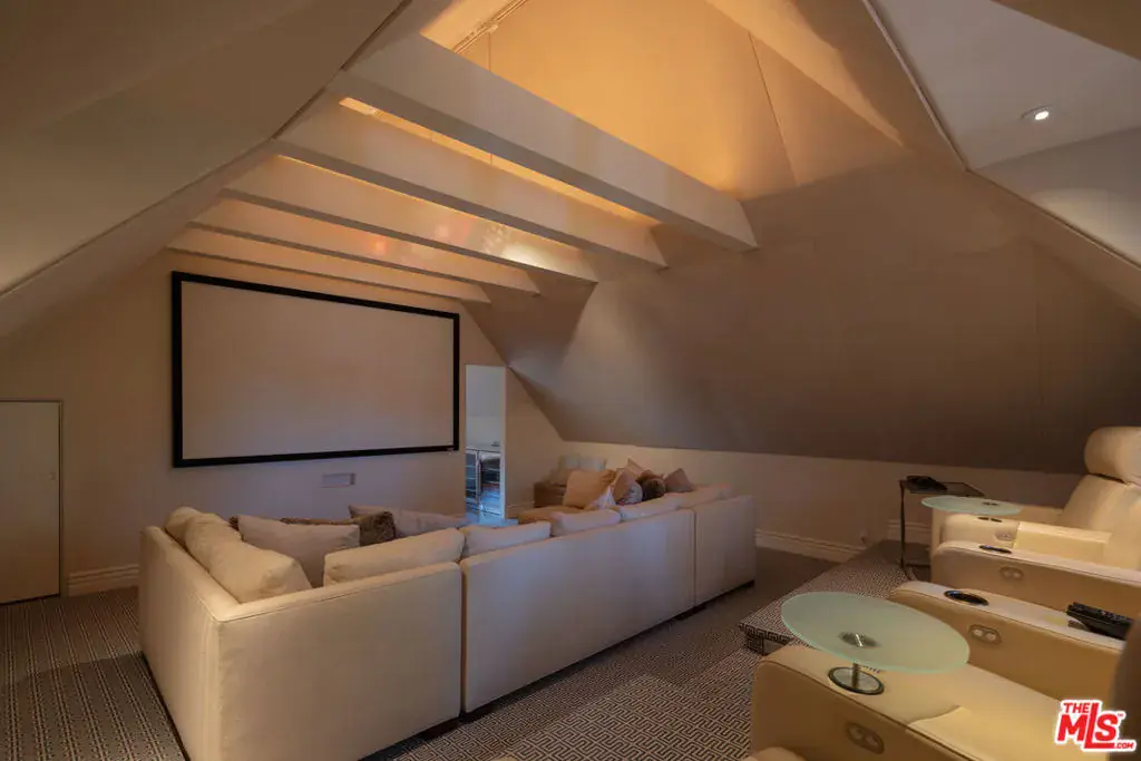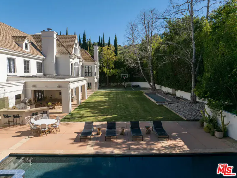 Privately set behind gates on one of Longridge Estates’ most desirable streets, this corner-lot residence offers both scale and warmth. Encircled by mature greenery, privacy hedging, and a motor court with a three-car garage, the property establishes an immediate sense of presence -one that continues inside through its refined, contemporary interiors. Inside, a sweeping double staircase introduces an open, light-filled foyer leading to the formal living room. Towering ceilings and tall windows frame views of the grounds, while a bespoke wet bar connects the living and family rooms (anchored by Limestone fireplaces) for easy entertaining. The kitchen was designed for both daily living and hosting, featuring a large center island, breakfast bar, multiple Sub-Zero refrigerators, a Viking range, and a walk-in pantry. The formal dining room opens through French doors to an outdoor entertaining terrace, fireplace lounge, full kitchen/bbq and bar, and wood-fired pizza oven – ideal for gatherings day or night. The primary suite includes a sitting area with a fireplace framed by French doors overlooking the outdoor grounds, along with a soaking tub encased within the marble-clad shower, dual vanities, and walk-in custom closet. Each additional bedroom includes its own en-suite bath and walk-in closet.Crowning the residence is a newly completed recreation level – an inspired hideaway beneath cozy, beam-accented ceilings and illuminated by sweeping skylights. Wrapped in custom wall treatments and anchored by a floor-to-ceiling brick fireplace, the space invites effortless gathering with its bespoke bar, plush lounge, and various game nooks. A bonus room, game room, and full bath extend its versatility. The residence also offers a richly toned office with coffered ceilings and an intimate sitting lounge, a fully equipped gym, and a private theater complete with its own library nook, lounge, snack bar, and bathroom. Outdoors, the grounds include a saltwater pool and spa, bocce court, full sports court perfect for a game of basketball or pickleball, and an expansive flat lawn surrounded by mature greenery for total privacy. Located just moments from Sherman Oaks’ top dining and shopping, with convenient access to Beverly Hills and nearby schools, this Longridge estate blends classic comfort with modern livability across every detail.
