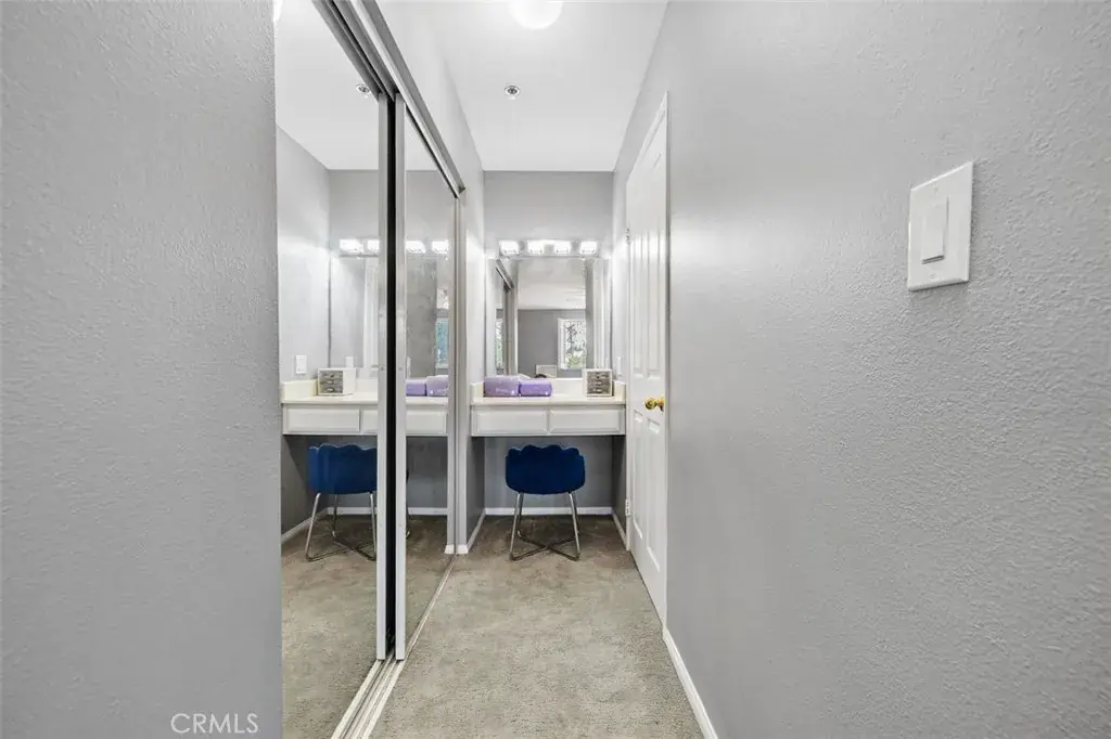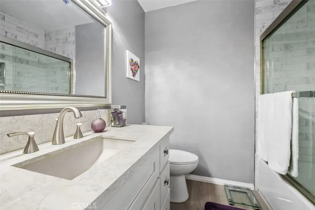 The modern kitchen features quartz countertops, classic subway tile backsplash, soft-closing cabinetry, and sleek Whirlpool appliances, blending timeless design with everyday functionality. The spacious primary suite offers a vanity dressing area and dual access to the primary bathroom, providing both privacy and convenience. Both bathrooms are thoughtfully updated with clean, contemporary finishes.