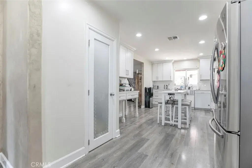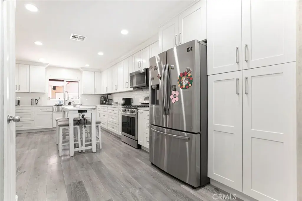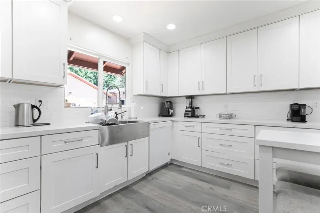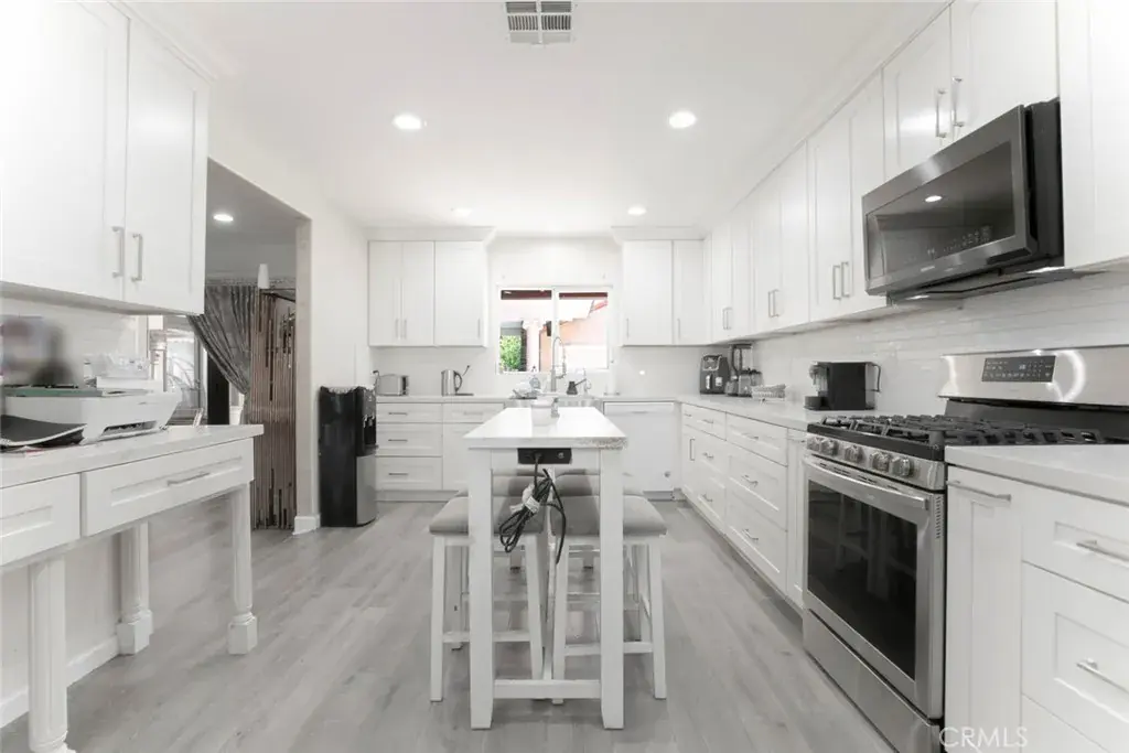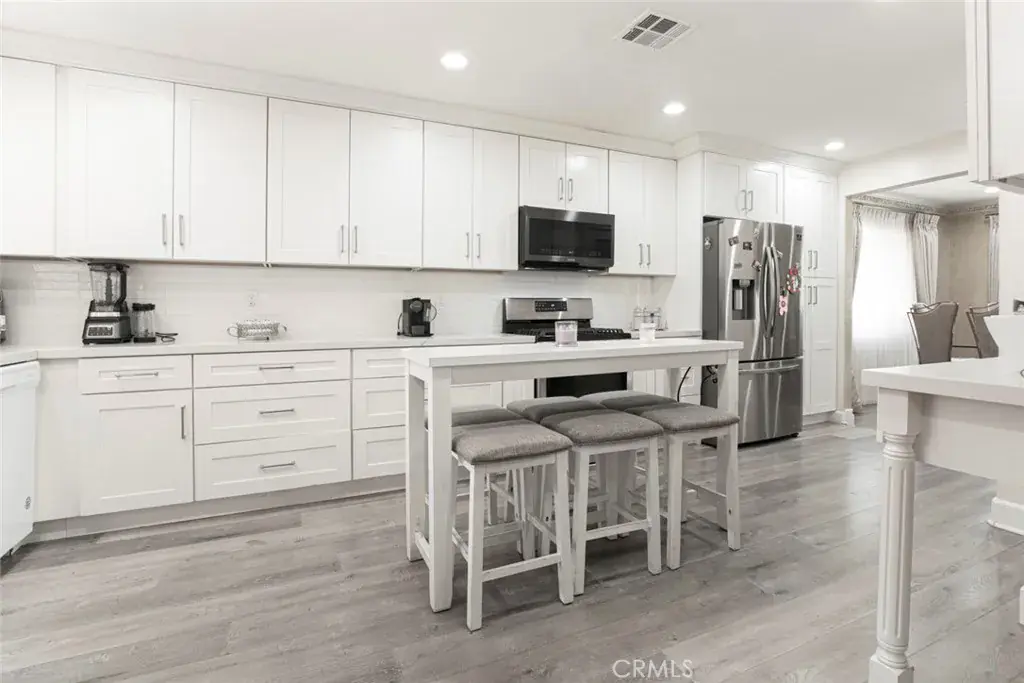 The modern kitchen features sleek cabinetry and quartz countertops, perfect for both everyday living and entertaining.