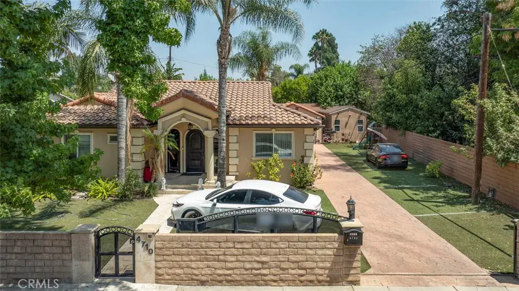 Privately gated with a spacious driveway that accommodates multiple vehicles, this property boasts gorgeous curb appeal with Spanish tile roofing, modern dual-pane windows, a custom front door, security cameras, and mature palm trees that frame the entrance.
