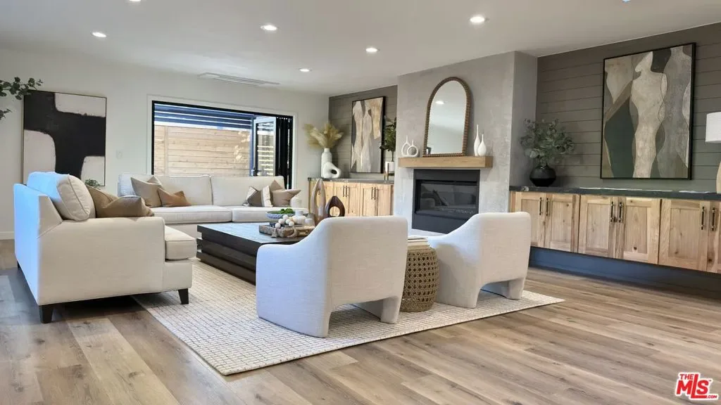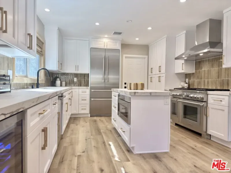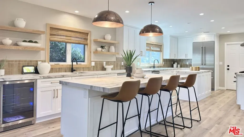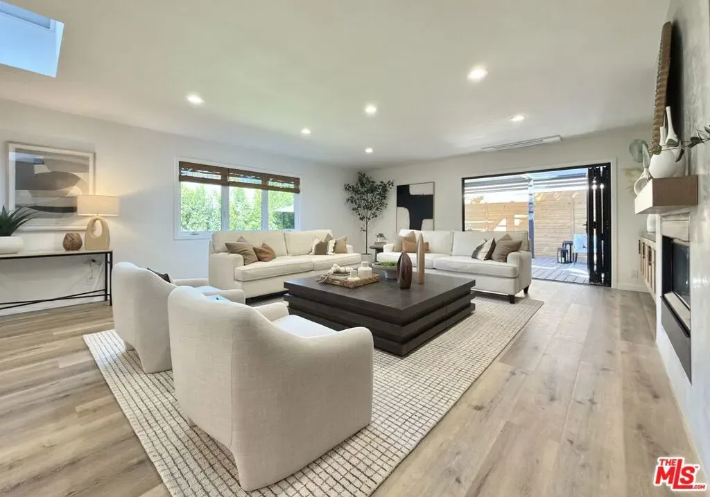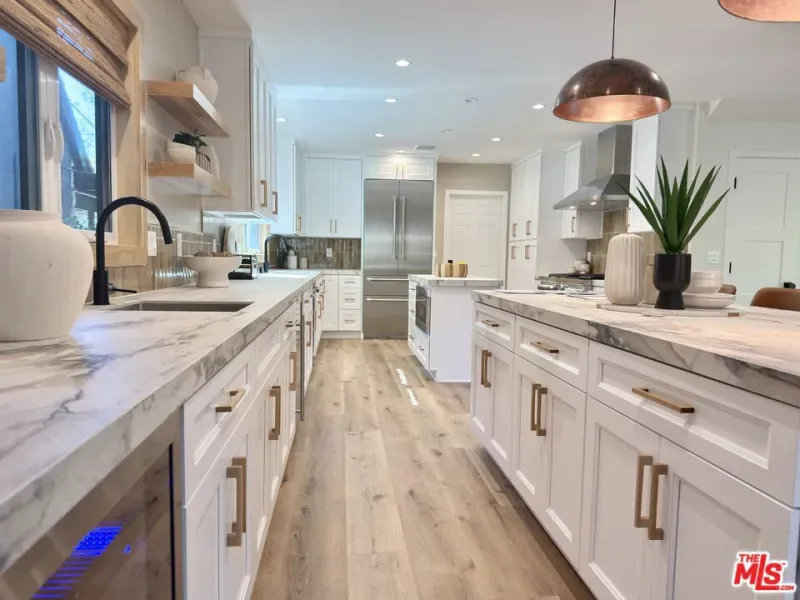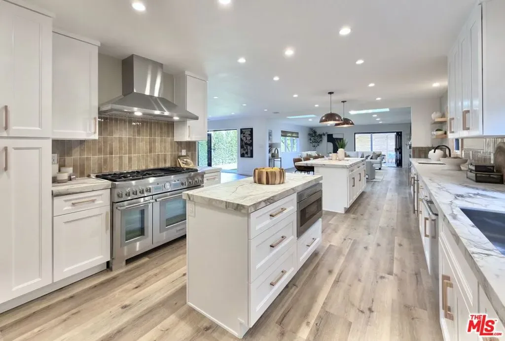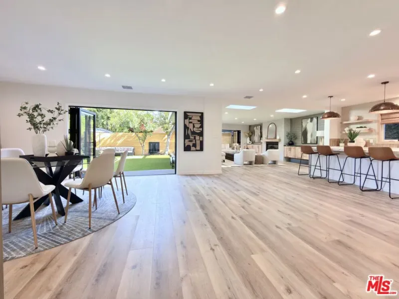Located in the coveted Chandler Estates area of Sherman Oaks. This two story home has an exceptional floor plan. Spacious open common areas on the first floor with all four bedrooms including two suites together on the second floor. Complete renovation with a warm calming design in mind that feels casually elegant and modern. The formal entry hall has a den/office/guest space with closet and fireplace to one side and a beautifully remodeled 3/4 bath on the other. Continuing on, the floor plan opens up to a spacious dining room, kitchen, and living room that are very connected all opening to back through folding patio doors that easily blend the inside to outside when entertaining or just wanting to enjoy a beautiful California day. The kitchen is spectacular anchored by two islands and pro-level stainless steel appliances. Additional features include both wine and beverage refrigerators, built-in microwave, pantry cabinets and closet, leathered finished porcelain counters, two sinks, and hand crafted artistic copper pendant lighting. The formal dining area is spacious and can support larger tables suitable for many. There’s a fireplace here too that will add elegance to any gathering. The living room features an entertainment wall offering ample storage/counter space flanking a third fireplace. Doors fold completely open to a private outdoor space protected by a louvered roof patio cover offering sun or shade as desired. Upstairs the primary suite features separate wall and walk-in closets. The bathroom has a double vanity with leather finished granite counters, double shower stall, and soaking tub. There’s another smaller bedroom suite with private bath leaving the hall bath shared by adjacent bedrooms 3 and 4. The laundry closet is also located on this floor. There’s an oversized two car garage that’s EV ready with direct access into the kitchen. The A/C is 3-zone new and efficient. Everything is done and well thought out for the buyer who just wants to move in and do nothing. A must see home! There is a recent pool/spa approved permit. Diagram and bid viewable at the home.