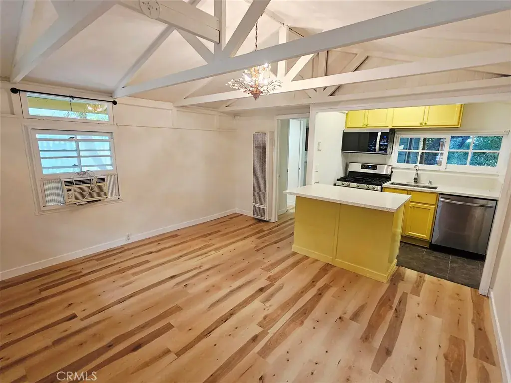 Step inside to an open, airy layout featuring a large glass door that fills the living space with natural light and frames picturesque views. The cozy living room boasts exposed white beams, adding character and warmth, while the updated kitchen comes complete with all appliances—ideal for cooking and entertaining.