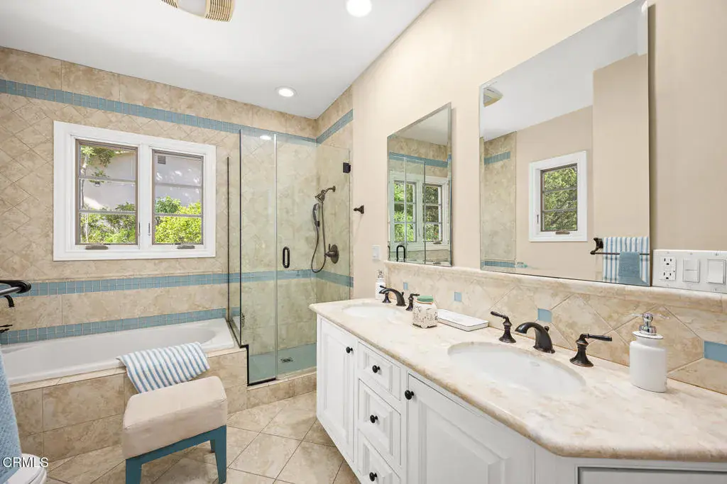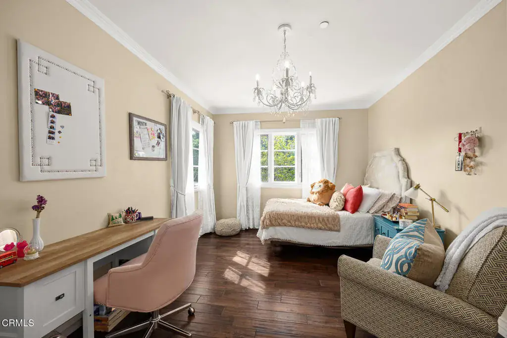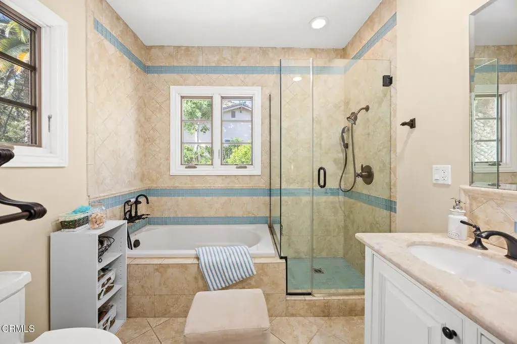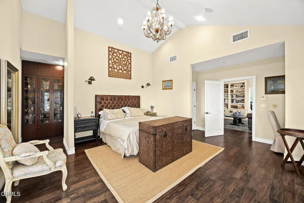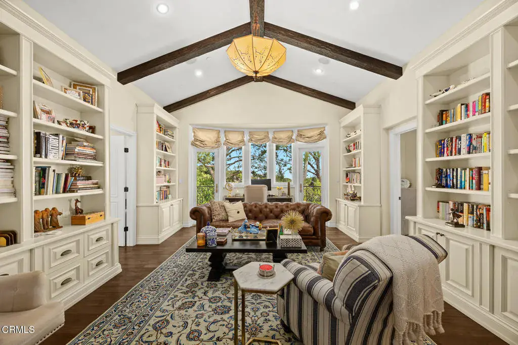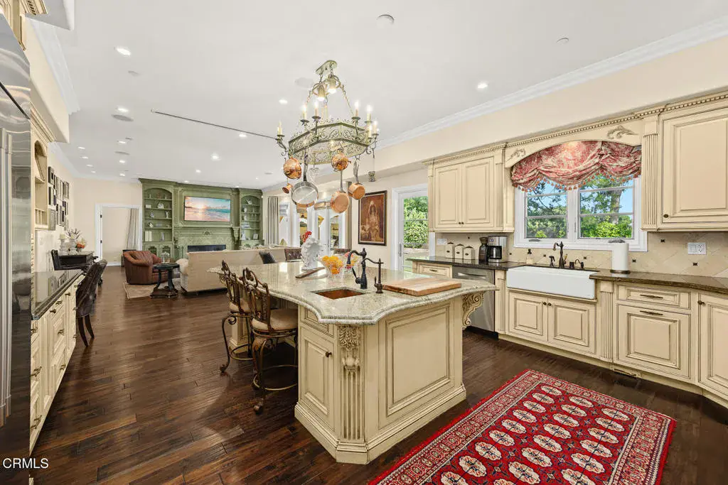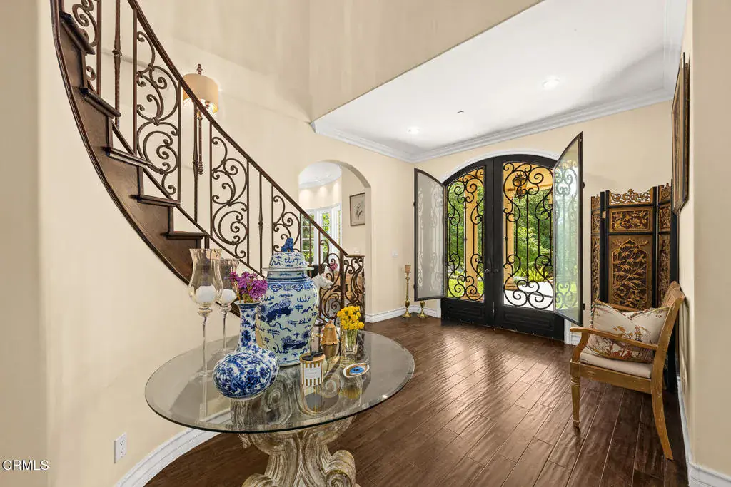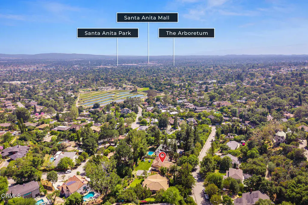 Welcome to this magnificent Mediterranean-style custom estate — a rare gem nestled in the heart of Sierra Madre.As you enter through the impressive 8.5ft custom iron and glass double doors, you’re greeted by a high-ceilinged entryway. The foyer leads into the heart of the main level: a chef’s dream kitchen with an 8-burner Viking stove, built-in refrigerator and Sub-Zero wine cooler.Open to the eat-in kitchen is the living room, complete with a wood-burning fireplace and bespoke built-in cabinetry for television and immersive sound AV components.The formal living room features a second wood-burning fireplace with a distinctive marble mantle. This elegant space flows into the formal dining room. The high ceilings throughout contribute to the grand and airy feel.The first floor also includes a guest suite, a powder room, and a versatile bonus room.Ascend the grand, curved staircase to the home’s upper level. There, you’re welcomed by a stunning custom library with vaulted and beamed ceilings with two built-in Spanish-style desks. The curved balcony just outside the library offers sweeping views of city lights, treetops, and mountains.The primary suite – also with vaulted ceilings – serves as a retreat, featuring a walk-in dressing room with double doors leading to an en-suite bath. The primary bath boasts a Kohler jetted tub, a large rain shower, and a Toto Washlet. The suite also opens to a private balcony.Upstairs you’ll also find a private home gym, complete with yet another balcony. Two additional bedrooms with walk-in closets, a full bathroom with double vanities, and a generous laundry room complete the upper level.The park-like backyard is an entertainer’s dream. The outdoor space features a full outdoor kitchen with a Twin Eagles gas grill, and a Fornetto wood-burning pizza oven. A gas fireplace sits beneath a canopy with 36 solar panels, which help power the home and charge the two Tesla backup batteries.The terraced side yard is lined with several types of fruit-bearing trees, while the opposite side yard contains a boxed herb garden.Additional highlights include 2 HVAC units, 2 tankless water heaters, 2 LifeSource whole-house water filtration systems, 2 220 EV charging outlets located in the 3-car garage, recreational vehicle parking, 6 cam CCTV system, central vacuum and a multi-zone Sonos sound system.Don’t miss this rare opportunity to own a truly one-of-a-kind estate in beautiful Sierra Madre.