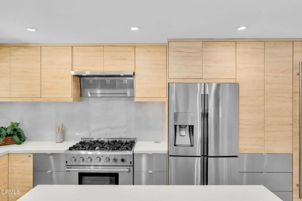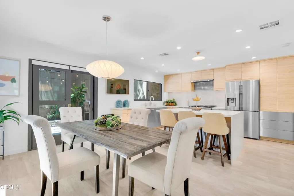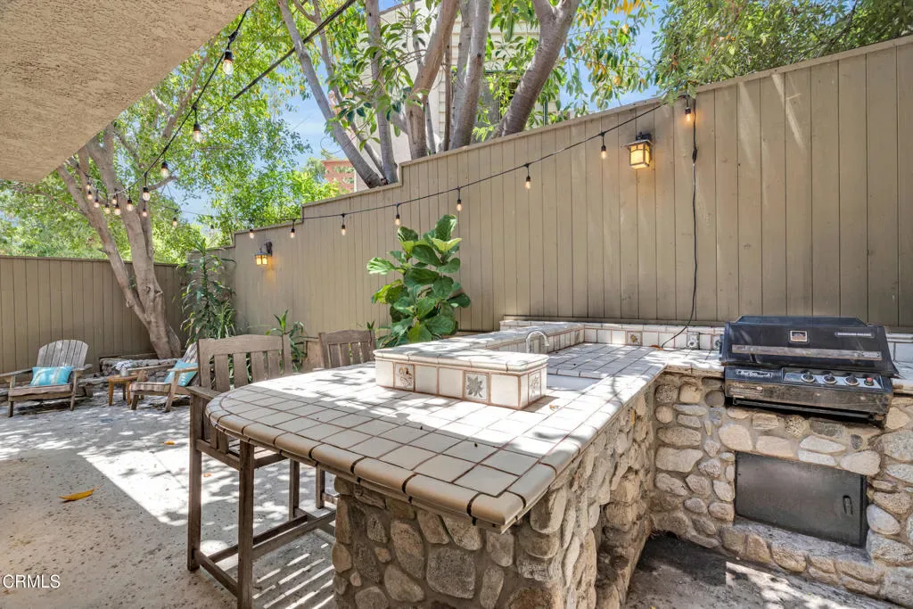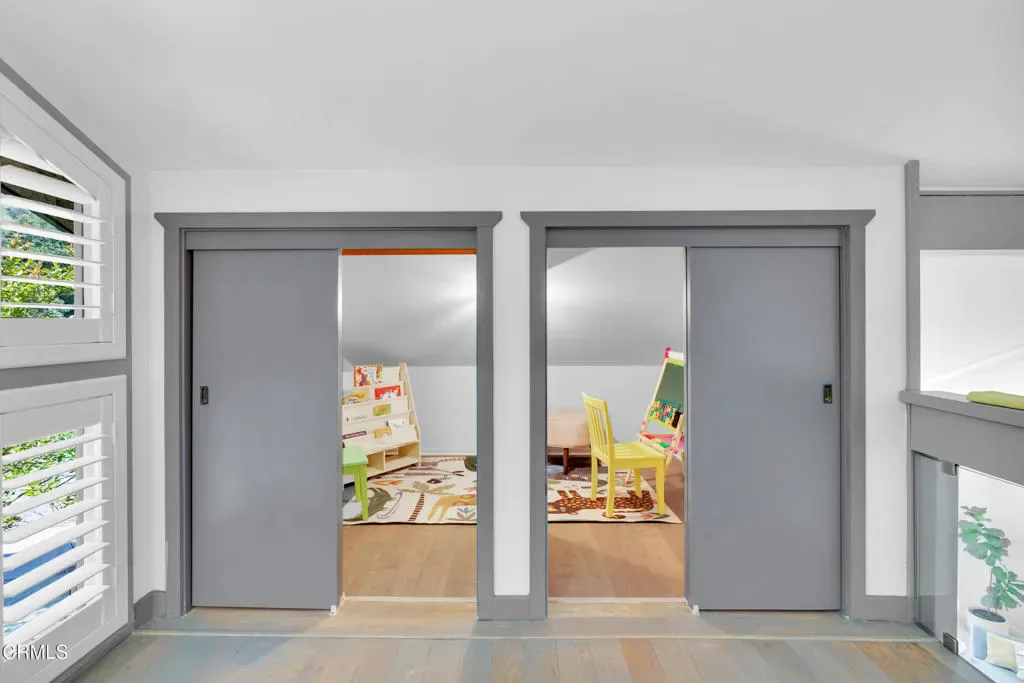 Nestled in the charming Marlborough Terrace neighborhood of Sierra Madre – this timeless modern home awaits. Step into the living room and prepare to be wowed: soaring two-story ceilings and expansive floor-to-ceiling, wall-to-wall windows flood the space with natural light, seamlessly blending the serene outdoors with the refined interior. Lush greenery and breathtaking mountain views complete the picture, creating a tranquil yet dramatic living experience. An open-concept floor plan connects the living room/dining area to a completely remodeled gourmet kitchen, complete with a center island and pantry. Outfitted with modern conveniences, it makes meal prep effortless and enjoyable. A striking open-riser staircase with sleek glass railing enhances the home’s expansive and airy feel. The primary suite delivers the second ‘wow’ factor with its soaring vaulted ceiling and walls of windows that frame breathtaking, therapeutic mountain views. Morning coffee on the private balcony will quickly become a cherished daily ritual. The suite was completely remodeled in 2020 and includes a luxurious spa-like bathroom, a walk-in closet, and custom window shutters. Two additional bedrooms share a balcony, offering more outdoor enjoyment. At the top of the stairs, a large nook provides flexible space for storage or a cozy play area for the children (or favorite pets). All bathrooms have recently been completely remodeled. Just outside the kitchen, an outdoor barbeque area provides the perfect setting for entertaining, whether hosting friends or enjoying intimate family gatherings. Expansive sliding doors from the living room open to a cozy front yard, creating a seamless indoor-outdoor living experience.