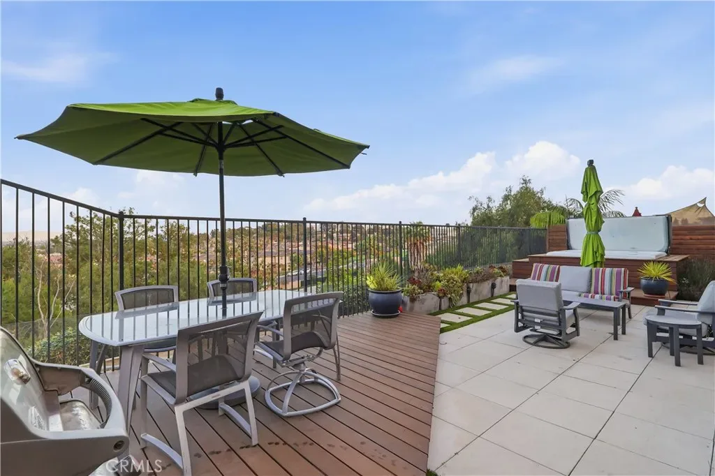 The low-maintenance backyard features a raised deck, above-ground spa, and panoramic views, perfect for enjoying sunrises, sunsets, and seasonal fireworks.