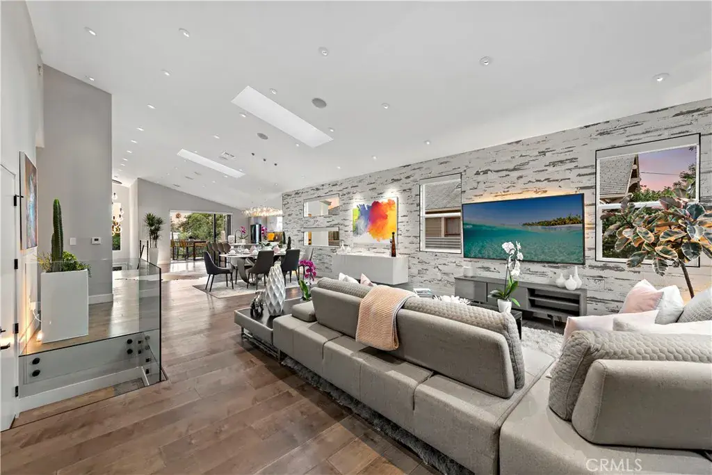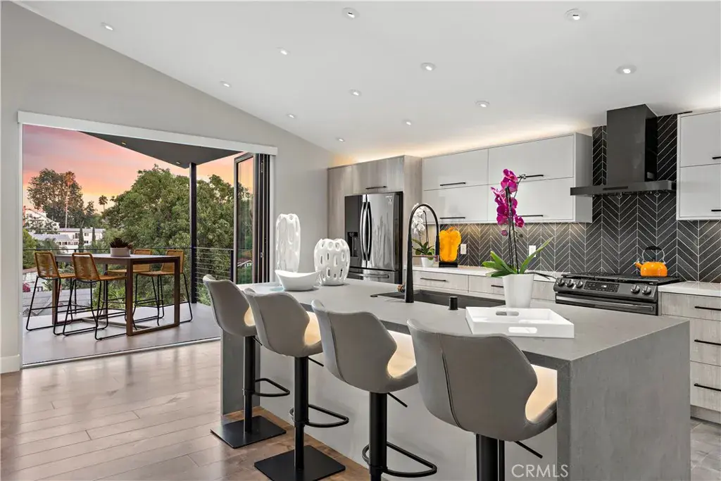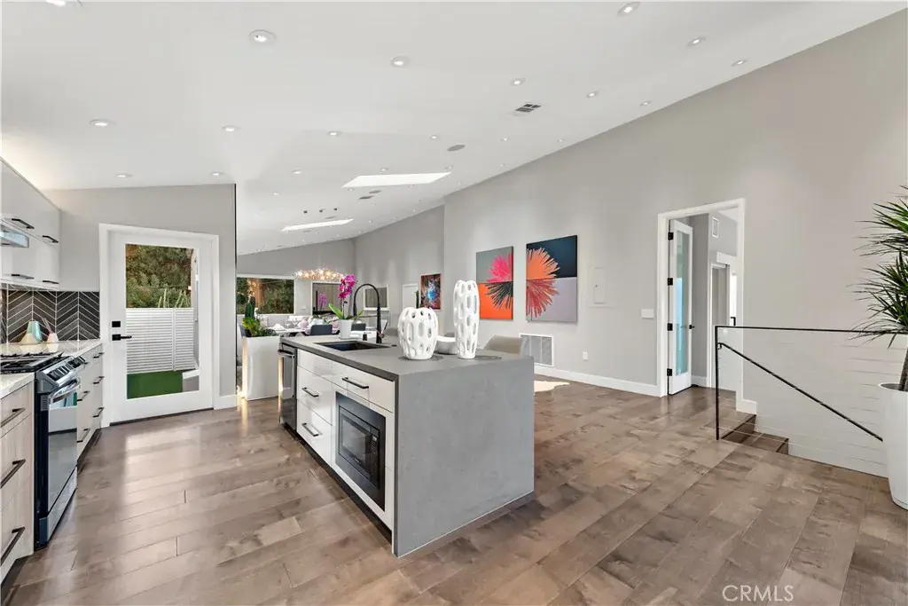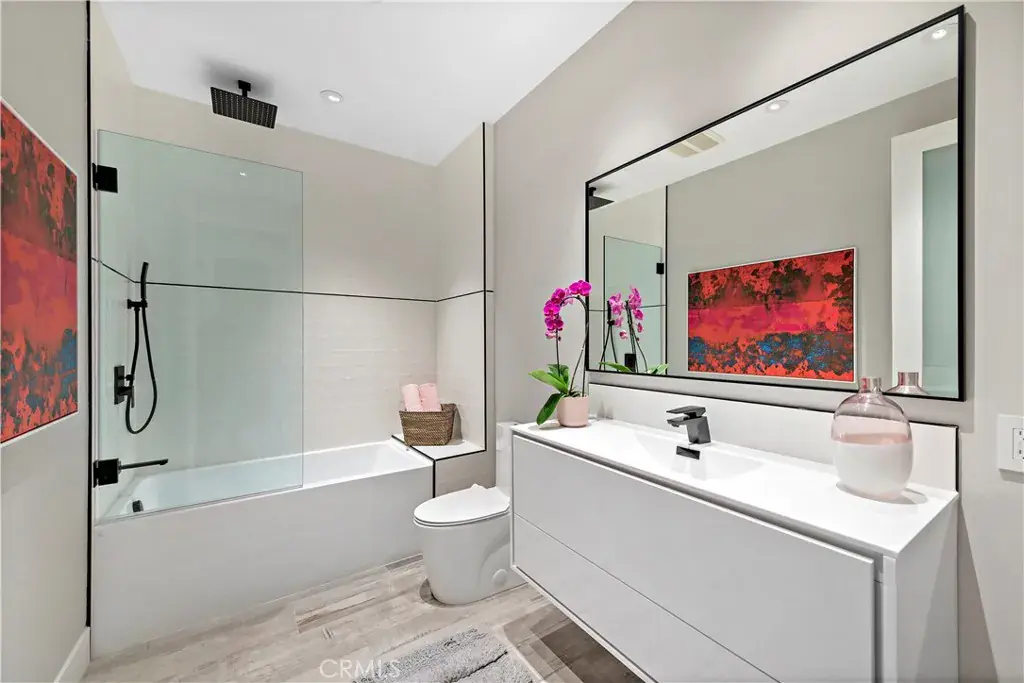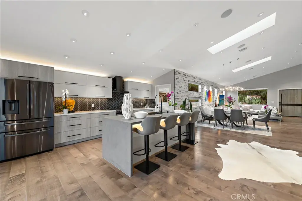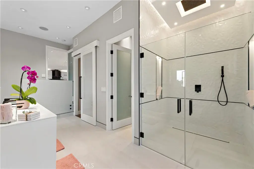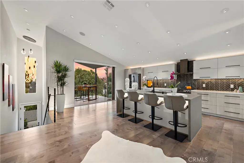 Interiors feature high ceilings, wide-plank wood flooring, skylights, and soft ambient LED lighting throughout, creating volume and natural light across the main living spaces. The chef’s kitchen anchors the home with a statement waterfall island, stone countertops, and sleek European soft-close cabinetry. Generous wall space offers a gallery-like setting ideal for art collections. All three bedrooms are generously sized, offering comfortable living with custom finishes and excellent proportions. European-inspired bathrooms are fully bespoke, showcasing refined tilework and elevated design.